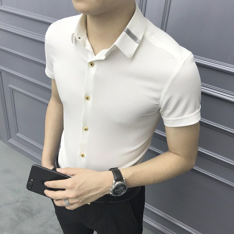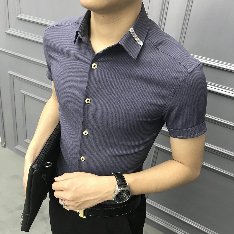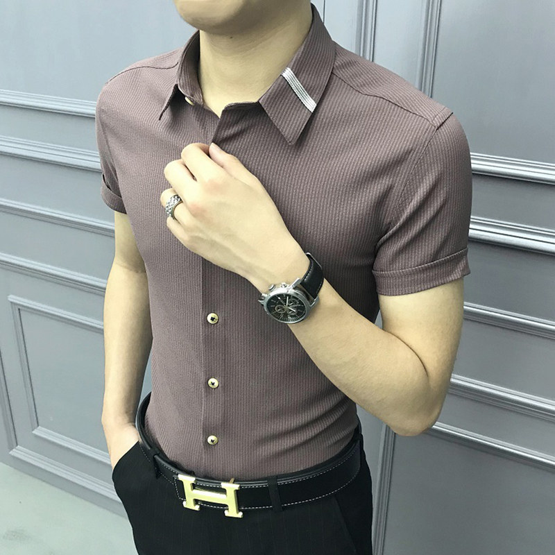 Rich Gui Bird Summer Short Sleeve Shirt Men's Body Youth Handsome Air Striped Korean Version Half Sleeve Shirt Male Trend Free of ironing