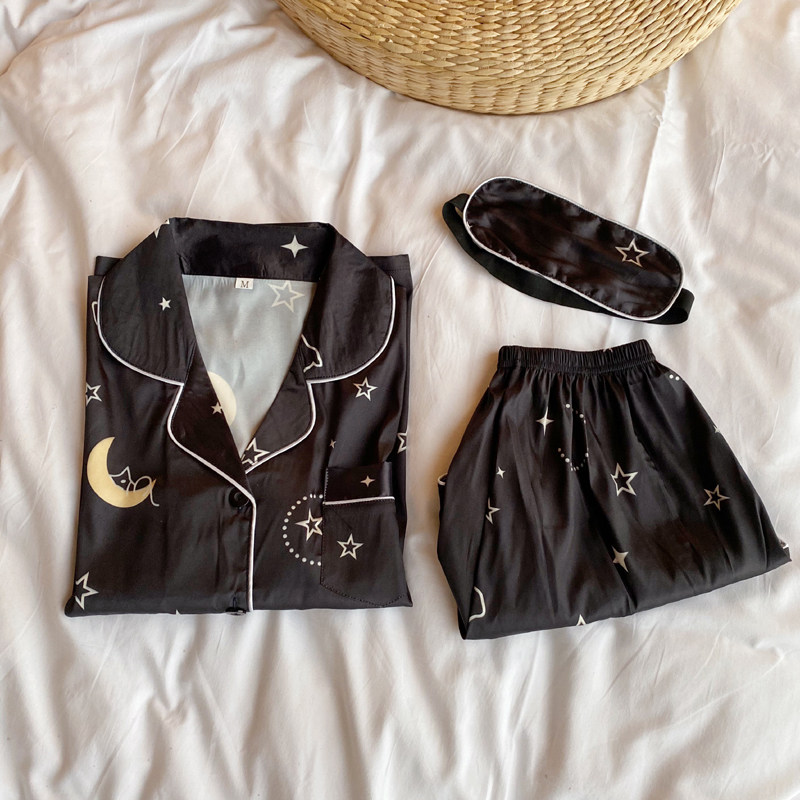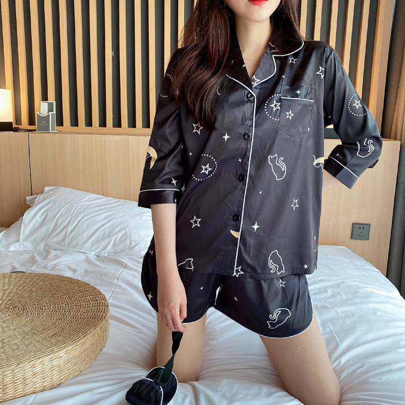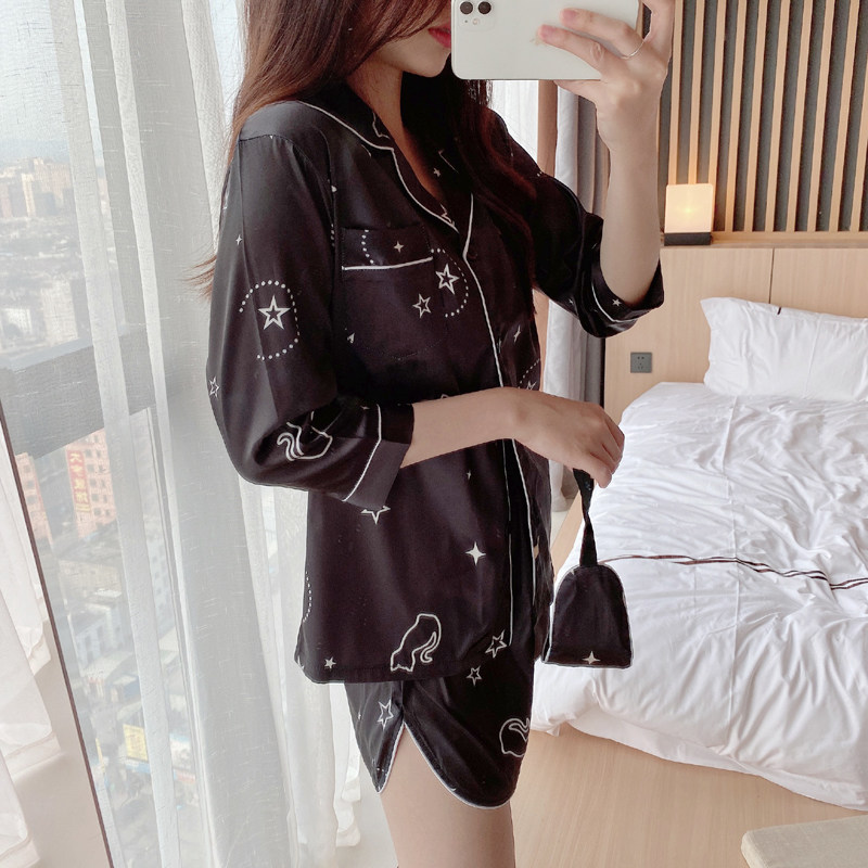 Pajamas women summer thin ice silk sexy black moon sleeves shorts net red cardigan home service suit women