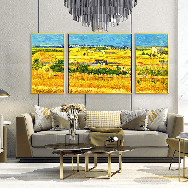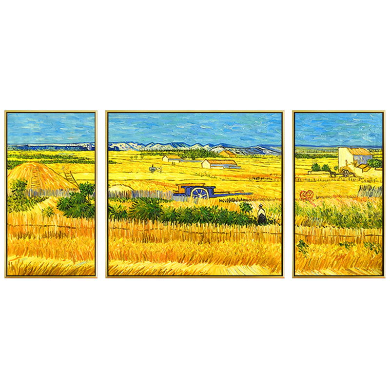Van Gogh harvest pure hand-painted living room sofa background wall triple oil painting hanging painting American dining room horizontal version decorative mural