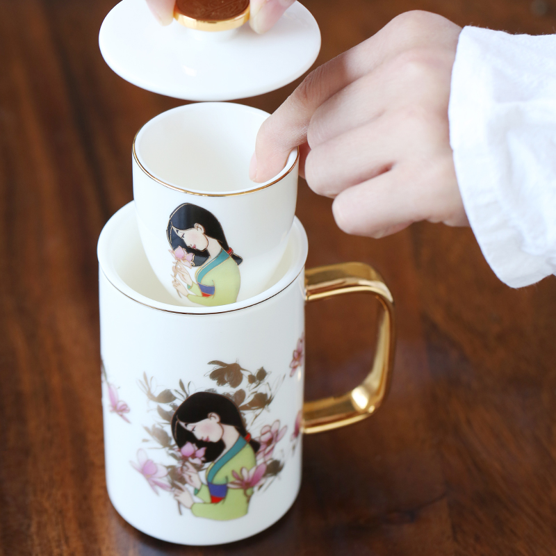 Delivery Tea Cup Goat Fat Jade Office Cup Flower Mulan Ceramic Water Cup Office Tea Cup Sketching Large Capacity Woman-Taobao
