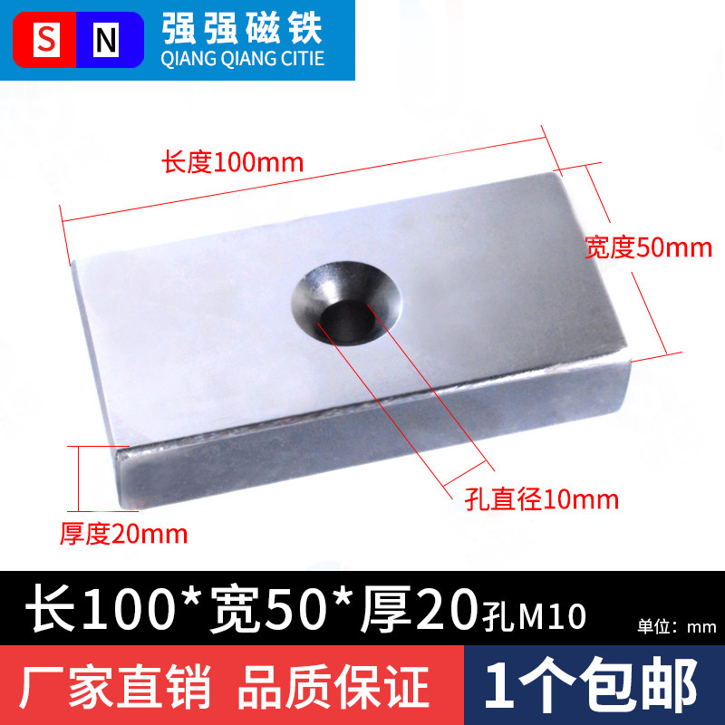 Strong magnetic magnet magnet neodymium iron boron rectangular super large salvage strong magnetic block 100*50*20 hole M10