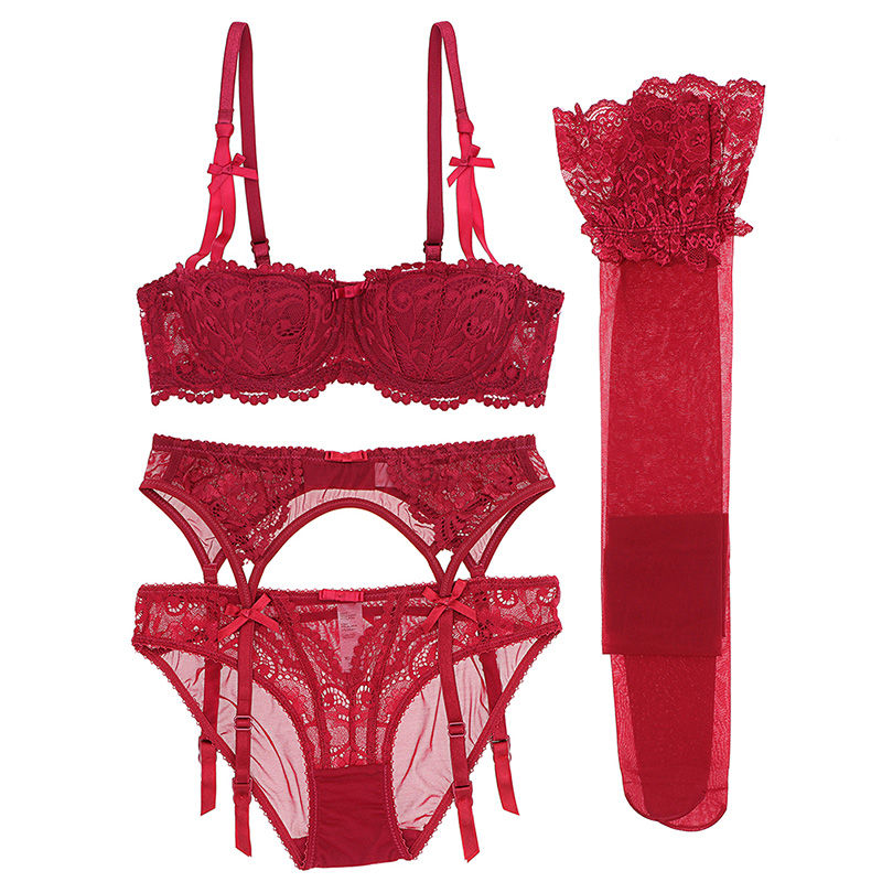 Garter suit red underwear female wedding bride small breasts gather sexy lace thin Half cup bra thong