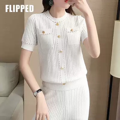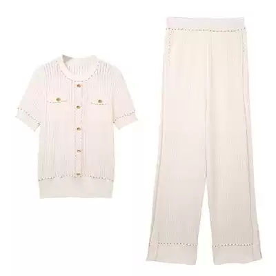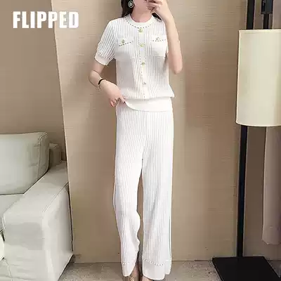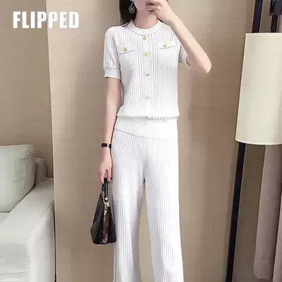 Knitted Ice Silk casual suit women's summer new age reduction simple short sleeve Joker ins wide leg pants two-piece women
