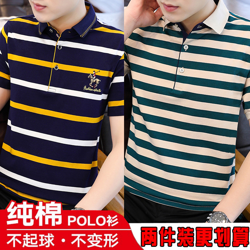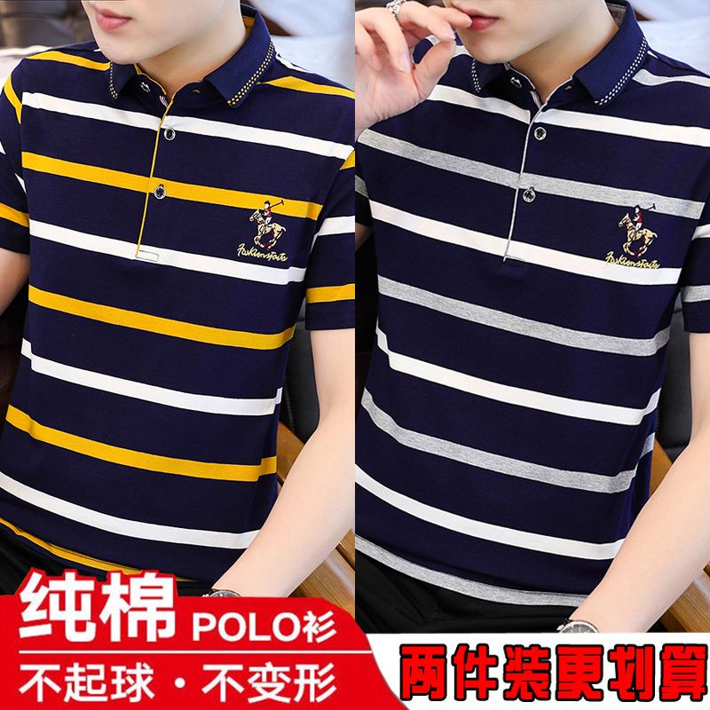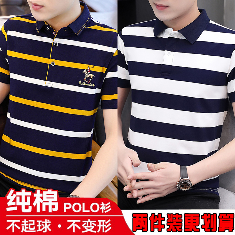 Summer business casual men's short sleeve T-shirt lapel cotton striped polo shirt T-shirt young and middle-aged large size clothes