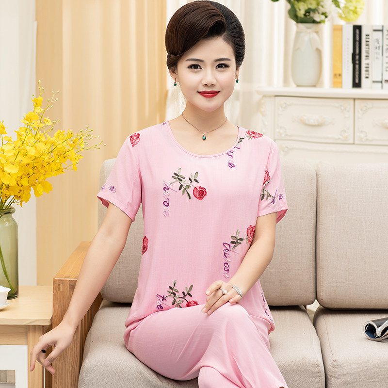 Middle-aged mother pajamas summer cotton short sleeve thin plus code middle-aged mother-in-law silk home clothing summer