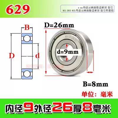 Deep groove ball miniature small bearing 629ZZ Z RS 2RS Inner diameter 9mm Outer diameter 26mm Thickness 8mm Bearing steel
