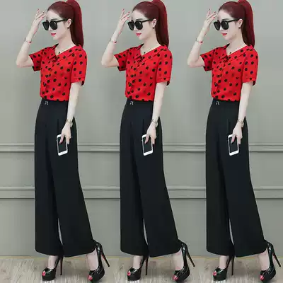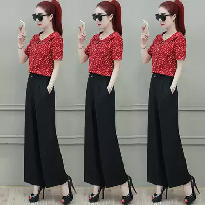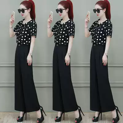 Summer high waist wide pants women fashion set 2021 New Short Sleeve Polo point shirt ankle-length pants professional two-piece set