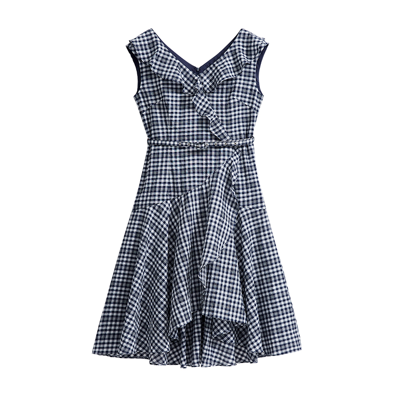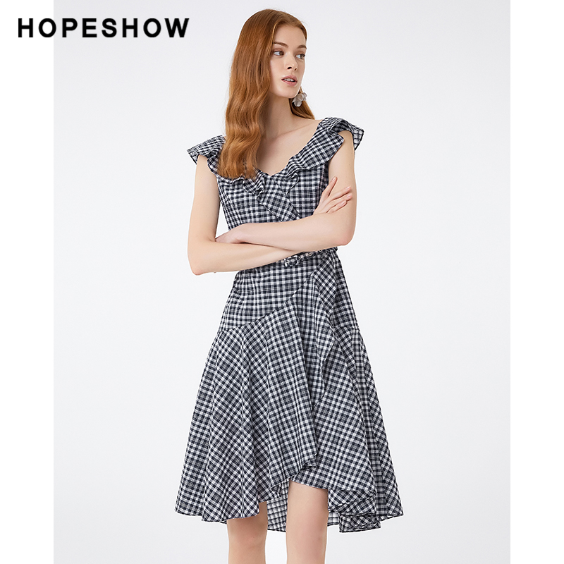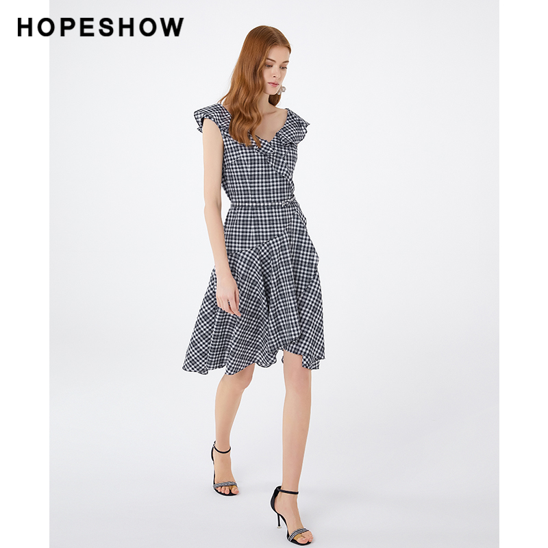 Red Sleeve Hopeshow Princess Dress Summer New Woman V Collar Plaid Sleeveless Lotus Leaf Collared reception waist dress