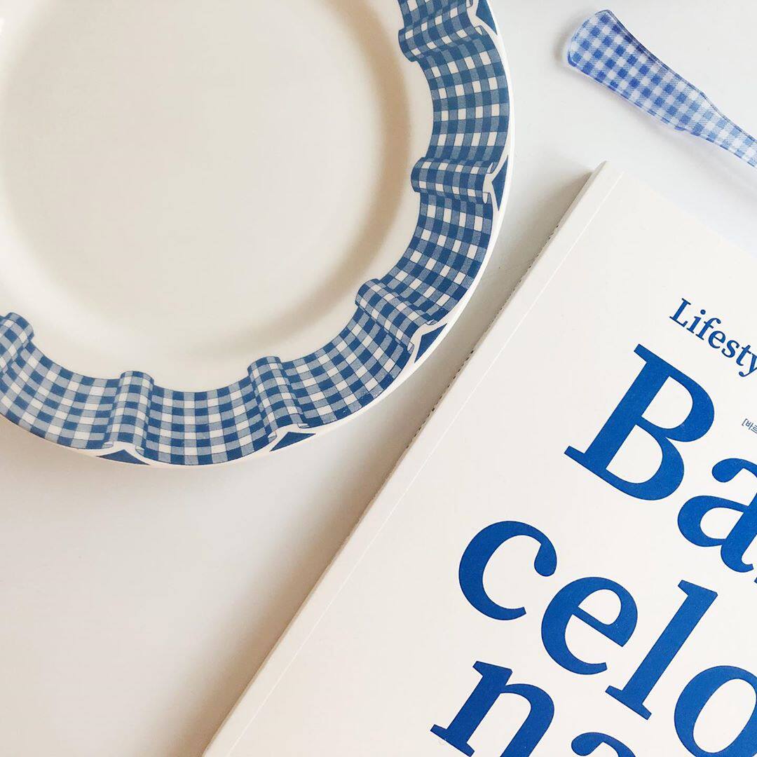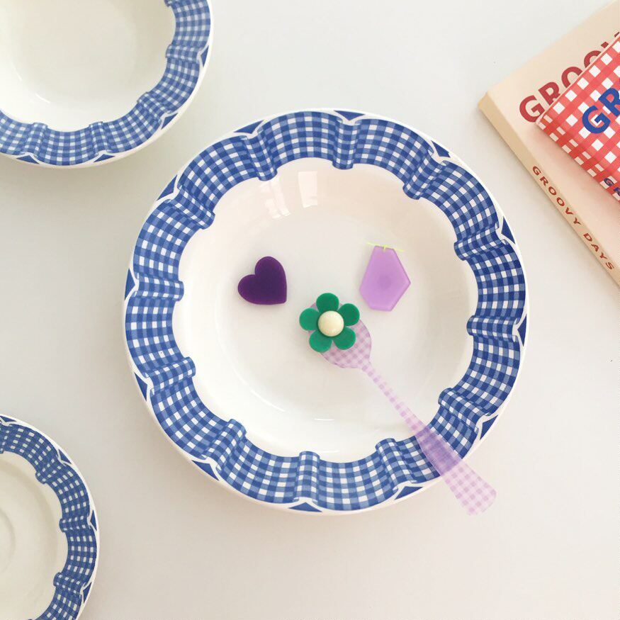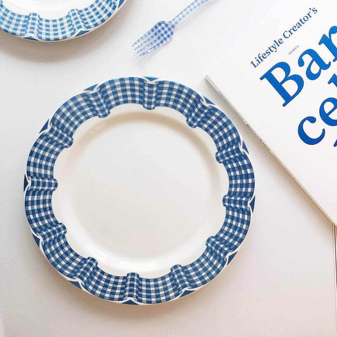 ES) French retro blue plaid lace ceramic dinner plate deep plate ins wind girl dessert plate flat plate