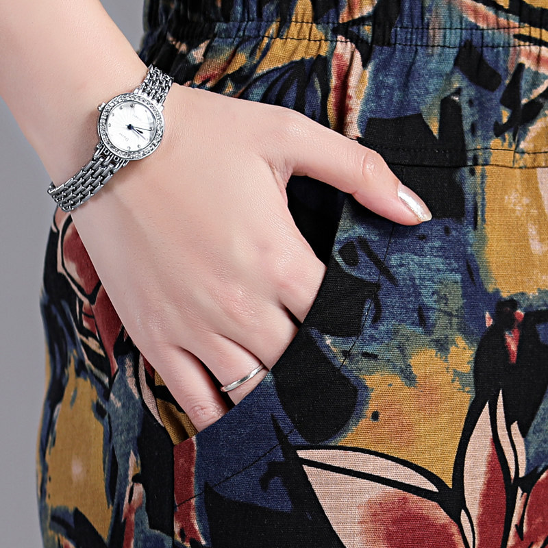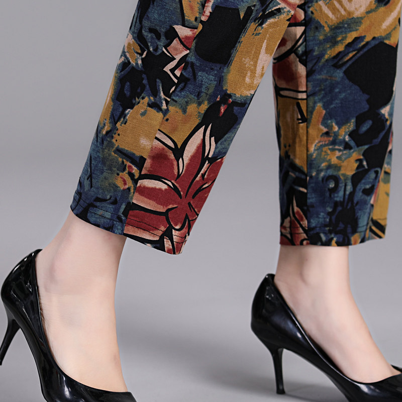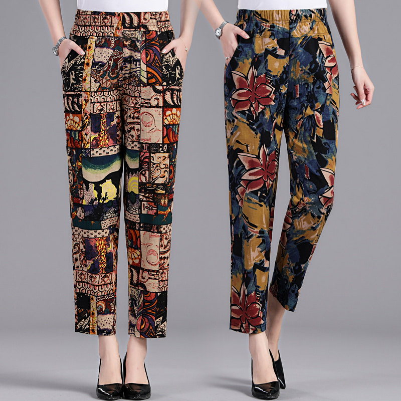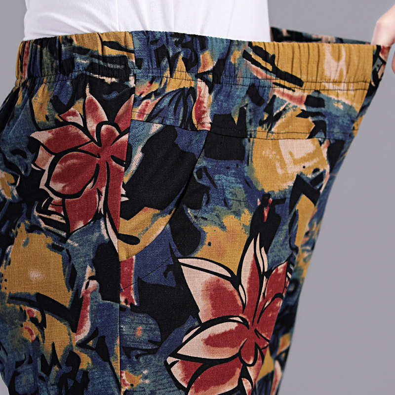 Middle-aged cotton linen pants mother summer flower pants old people loose leisure straight pants elastic waist nine points pants