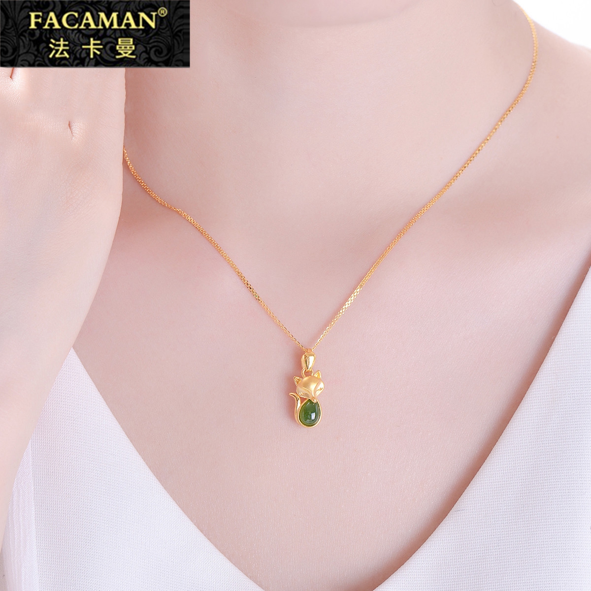 Foot Gold Necklace Female Inlaid and Tian Yubi jade Spinach Green Fox Lock Bone Chain Pendant Gold Inlaid Jade Fox Necklace