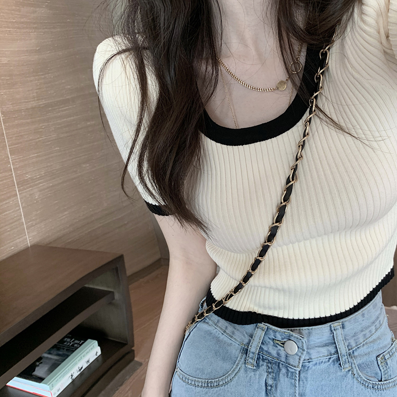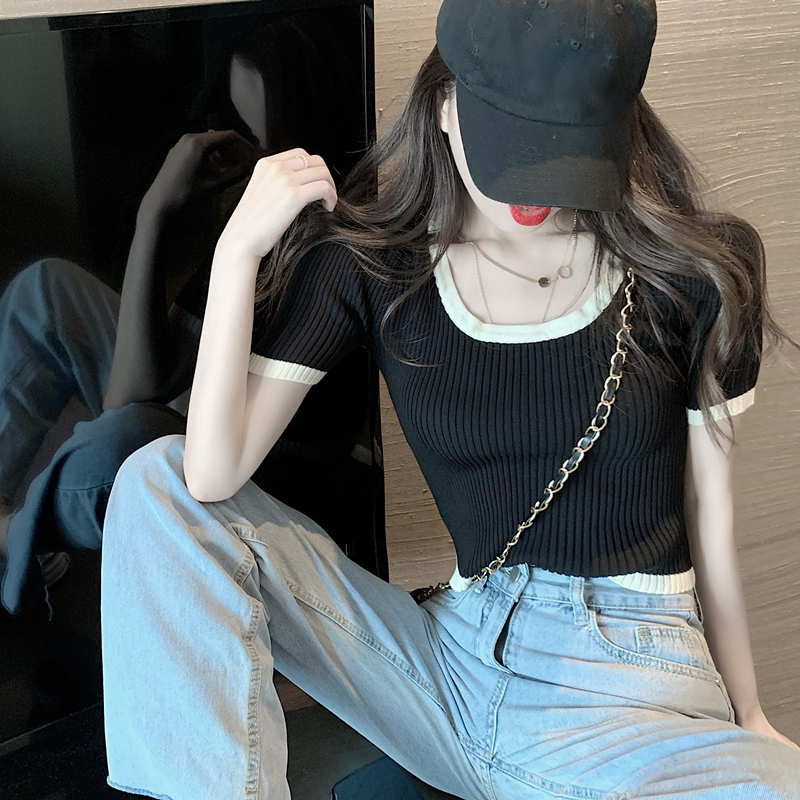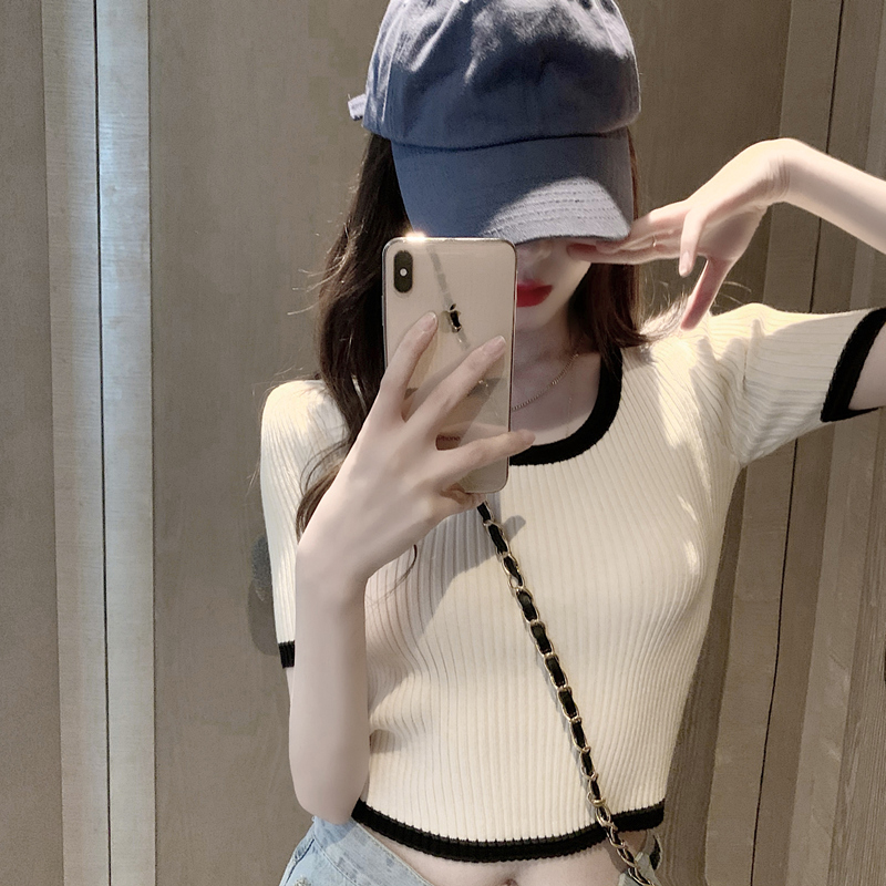 Tight t-shirt women's summer Korean retro temperament self-cultivation slim ice silk knitted short-sleeved contrast color short navel top