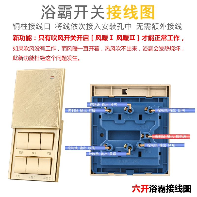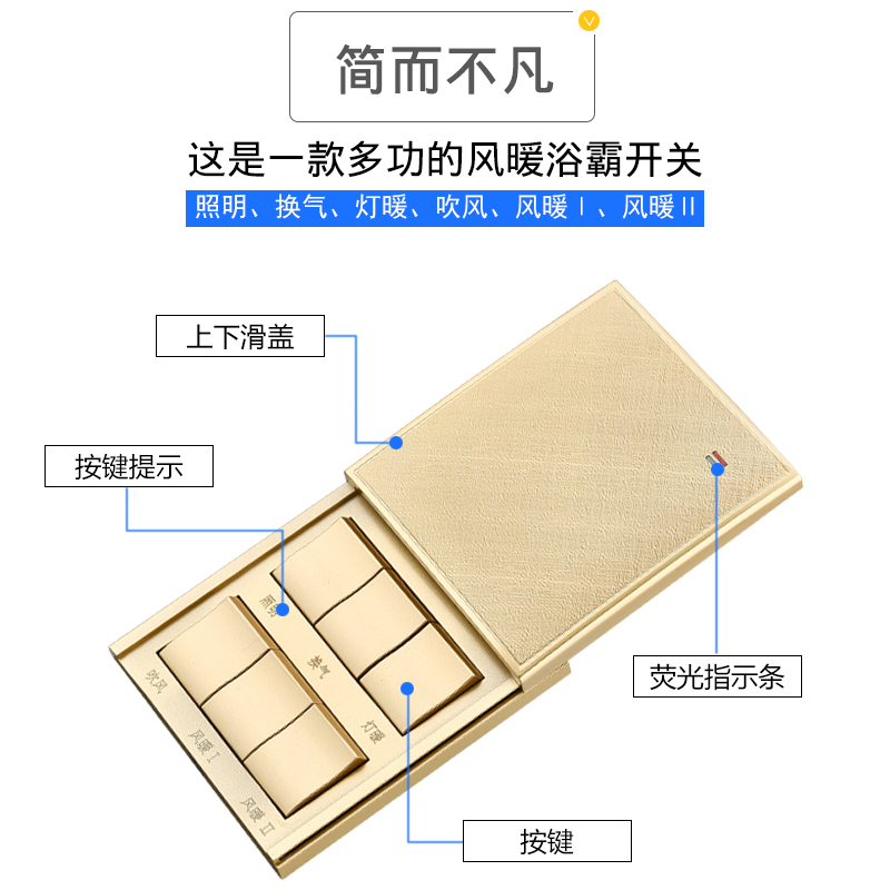 International Electrician 86 Type Gold 16A High Power Bath Master Switch Bathroom Air Heating Universal Type with Waterproof Slide Cover 6 Open