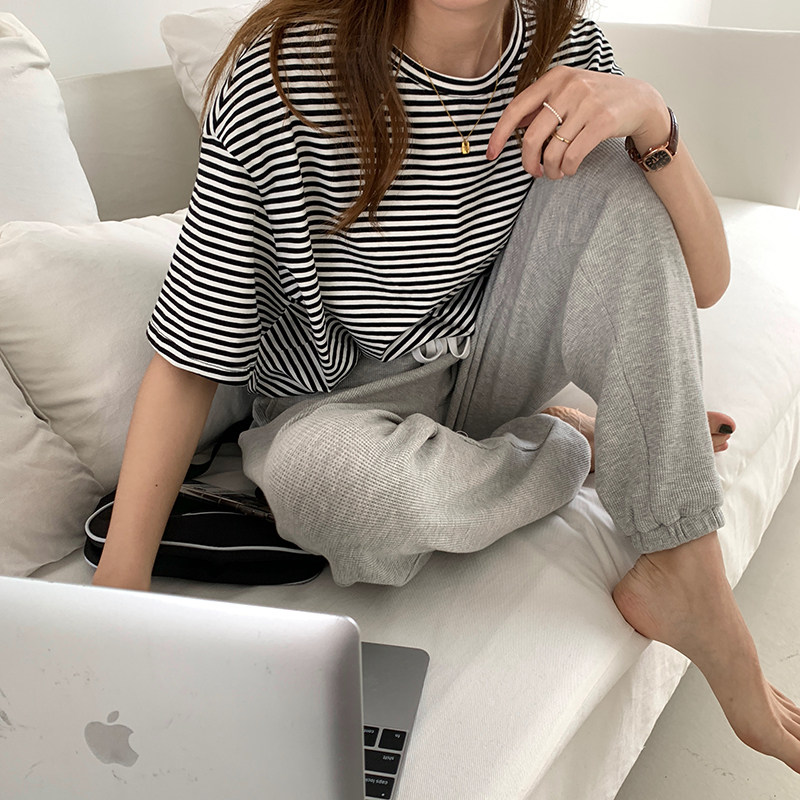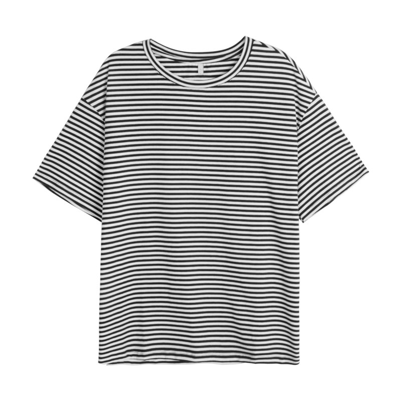 Japanese SLY2020 summer chic base striped color pattern round neck loose slim short sleeve T-shirt blouse