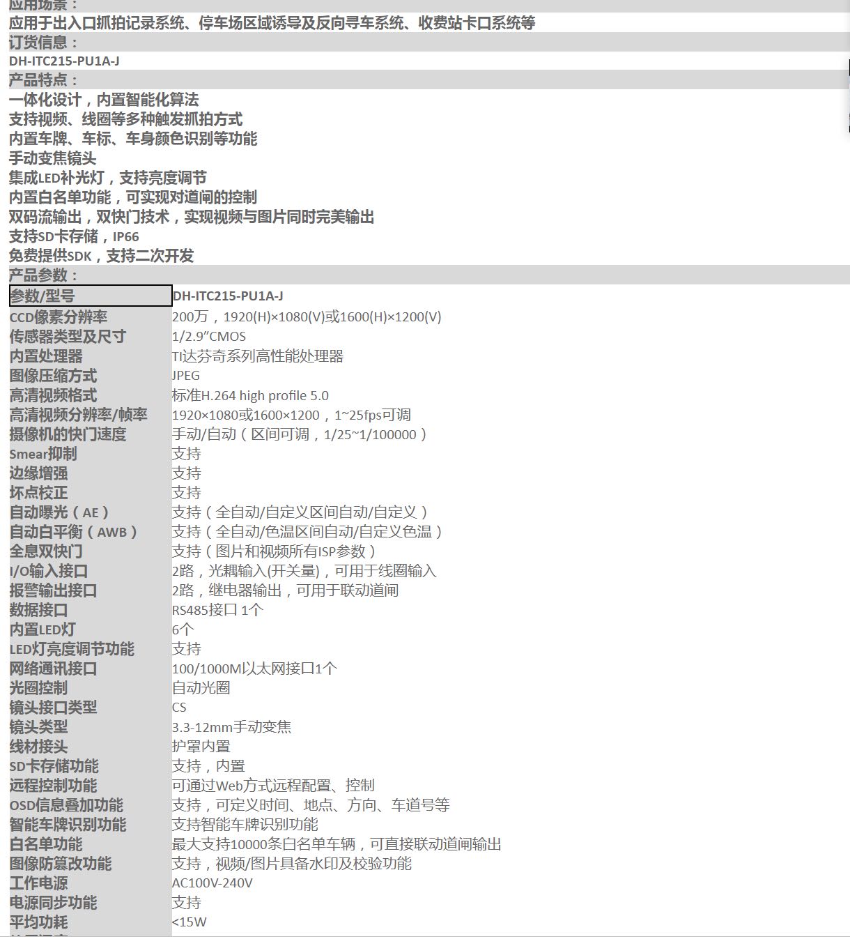 Dahua 2 million bayonet license plate network camera DH-ITC215-PU1A-J intelligent license plate recognition machine