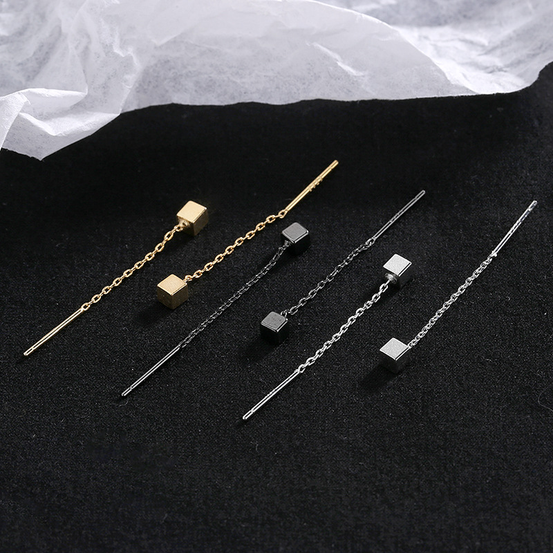 s925 silver small square block ear chain minimalist Temperament Personality Short earbuds Frosty Wind Net Red Delicate Mini Earrings