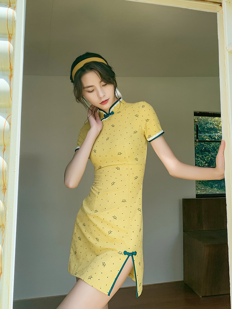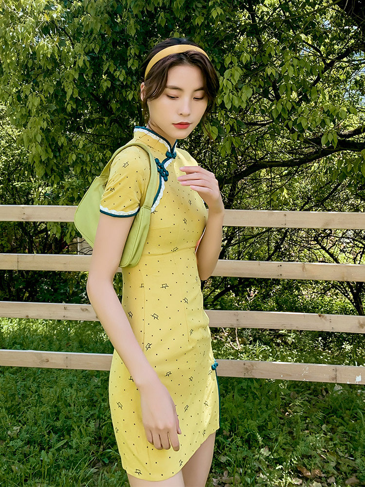 Yellow Qipao 2022 New Small Subshort Retro Improved Young Girl's Everyday Foreign Dress Spring Summer