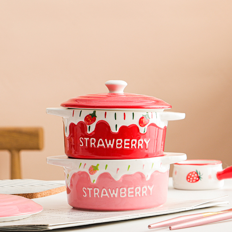 Cute Ceramic Binaural Bowl Breakfast Bowl with lid Steamed Egg Bowl Girl Powder Porcelain Bowl Home Strawberry Dessert Bowl Leather Milk Bowl