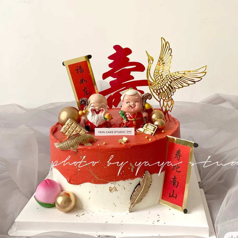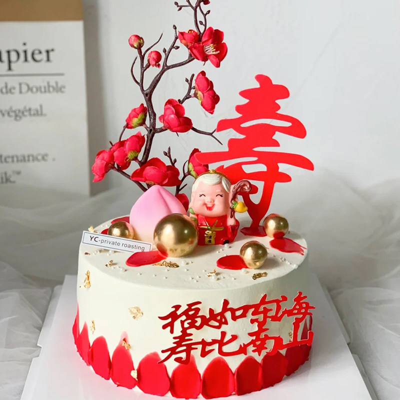 Birthday plum red fan Birthday peach birthday cake decoration package Shougong Shou Po old man red birthday plug-in ornaments