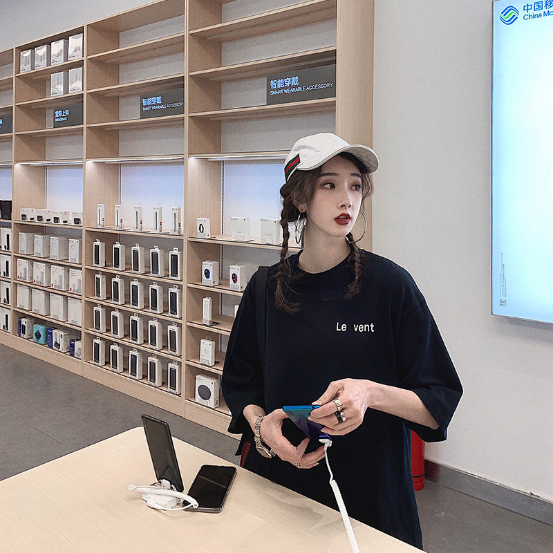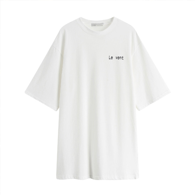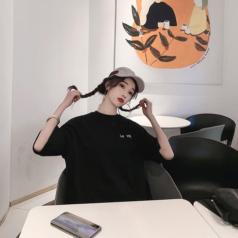 Large size embroidered short sleeve t-shirt in tide half-sleeve T-shirt summer new loose medium and long version bf black tops
