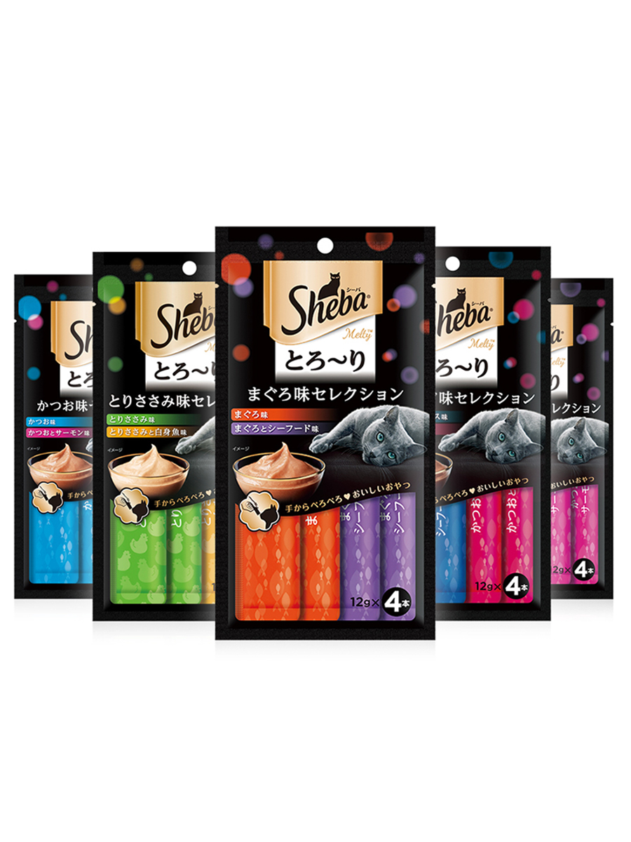 (Dark Blue and Red A) Ocean Exclusive Bonito and Shrimp (Light Blue and Red B) Sea and Land Exclusive Bonito Salmon (Green and Yellow C) Chicken and Bonito (Purple Orange D) Tuna Ocean Fish and Shrimp (Purple Pink E) Sea