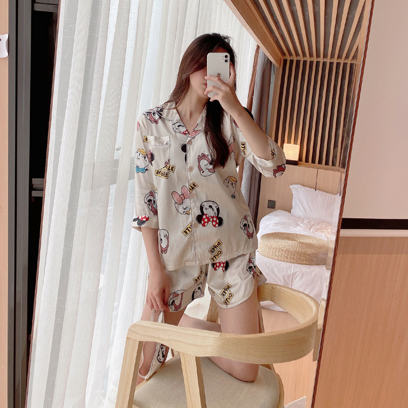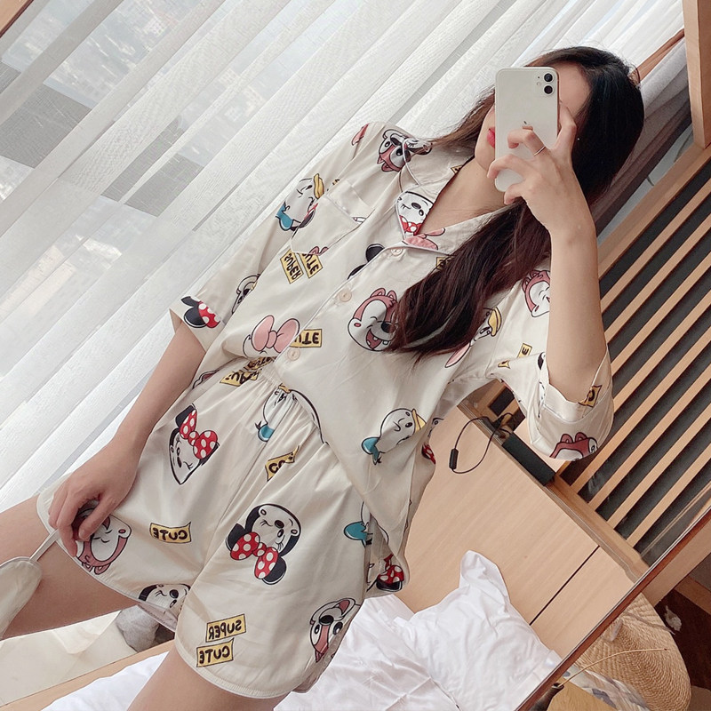 Pajamas women's summer cartoon plaid net red printing ice silk thin suit pajamas ins sleeve shorts home service