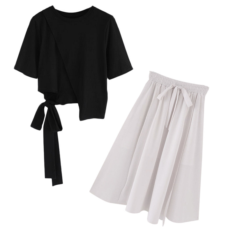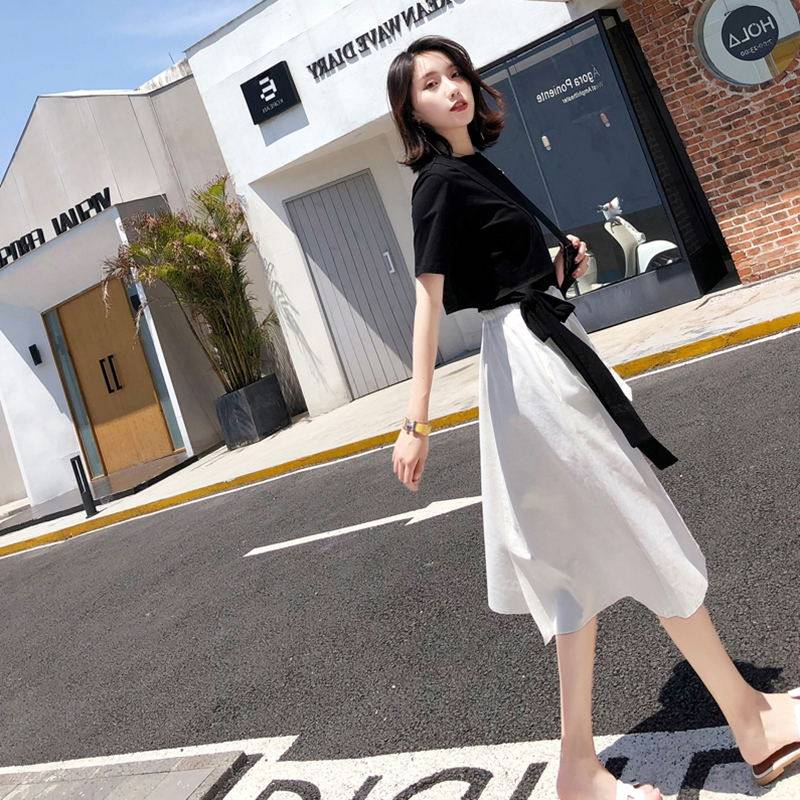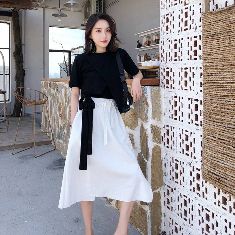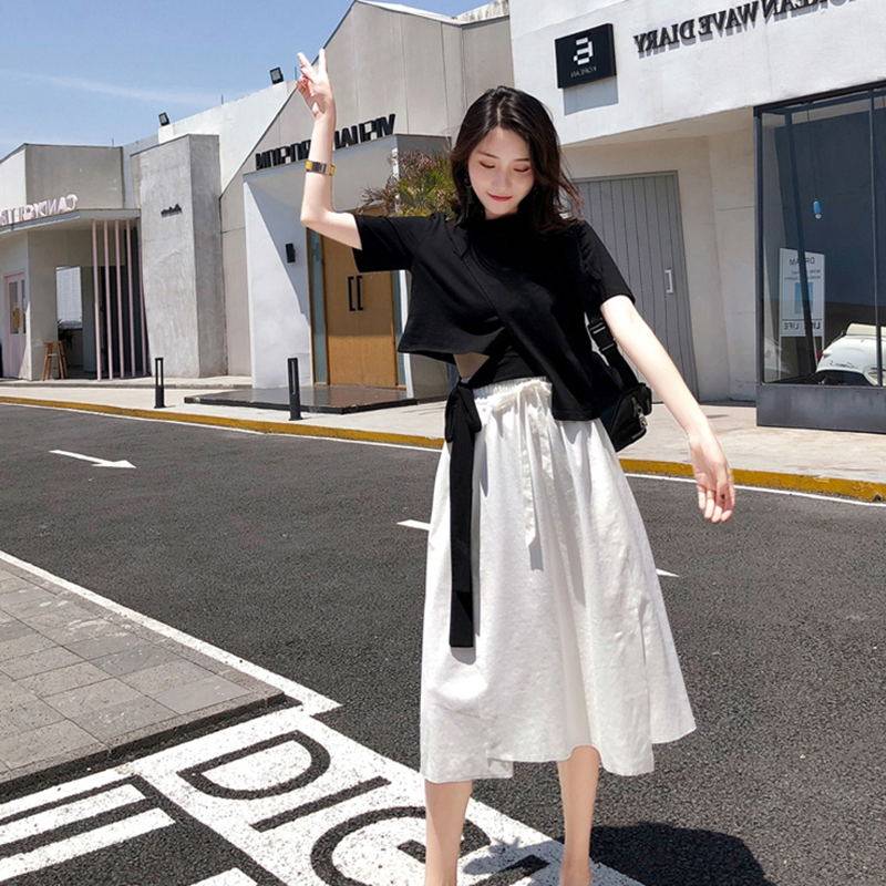 European station ins women's 2021 summer new design sense black T-shirt white skirt set Net red two-piece set