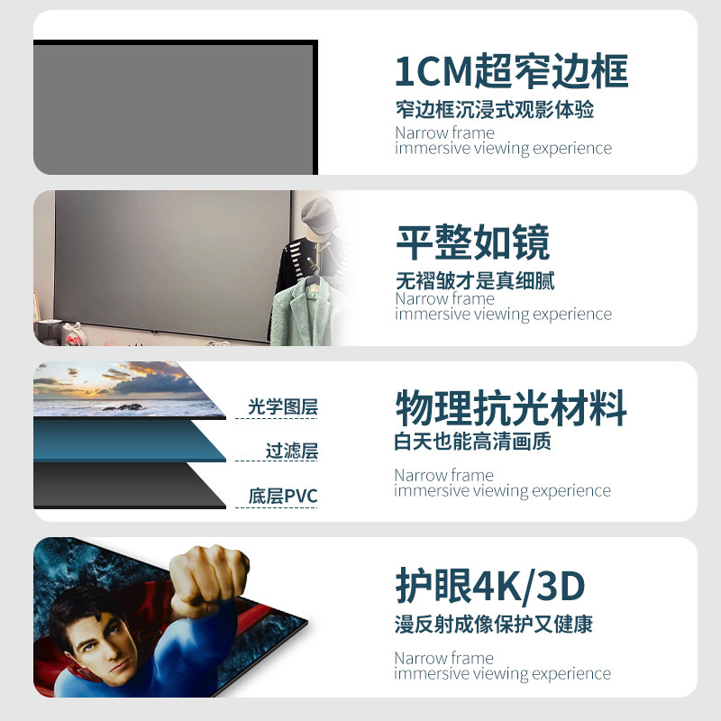 Dust feather anti-light curtain fabric narrow with frame screen high definition projection cloth with gray crystal anti-light curtain cloth 60 inches 72 inches 84 inches 120 inches 120 inches 133 inches 150 inches 16:9 projector screen
