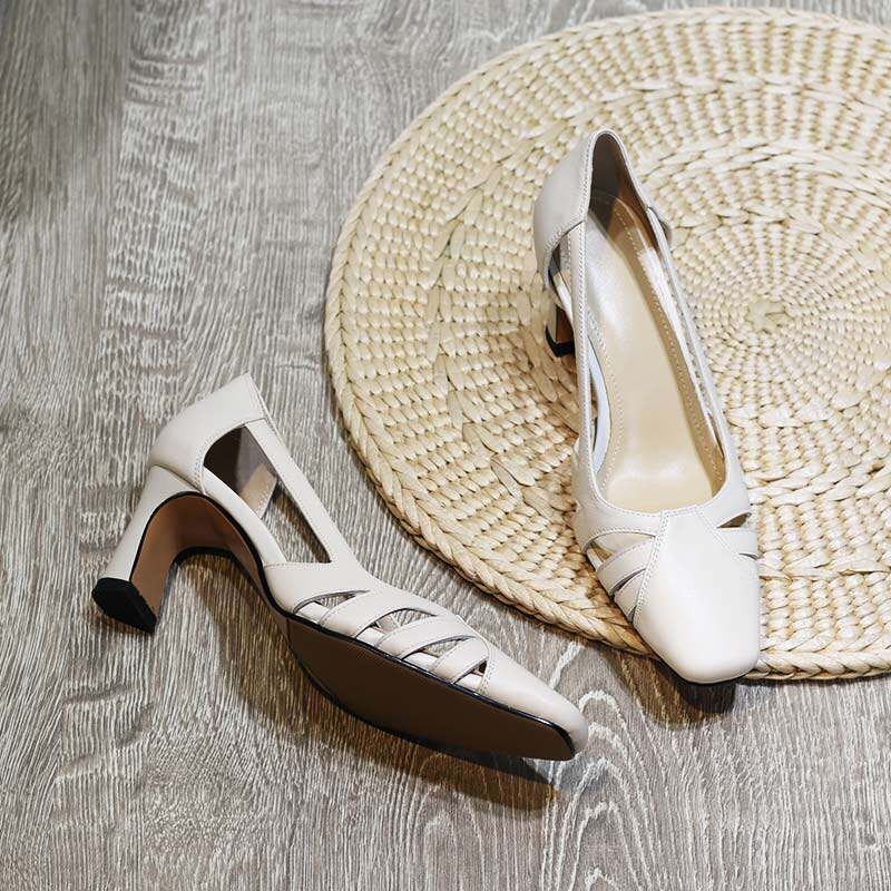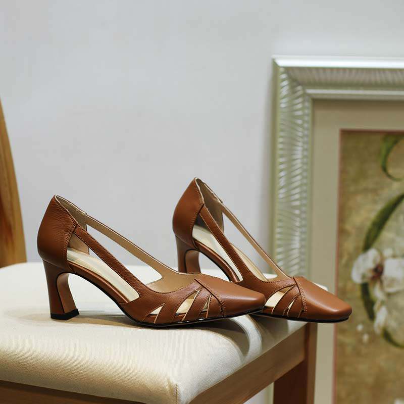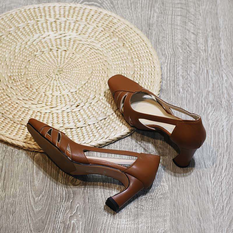 Brown high-heeled sandals women's net red fairy shoes European style leather hollow square toe shoes breathable four seasons shoes