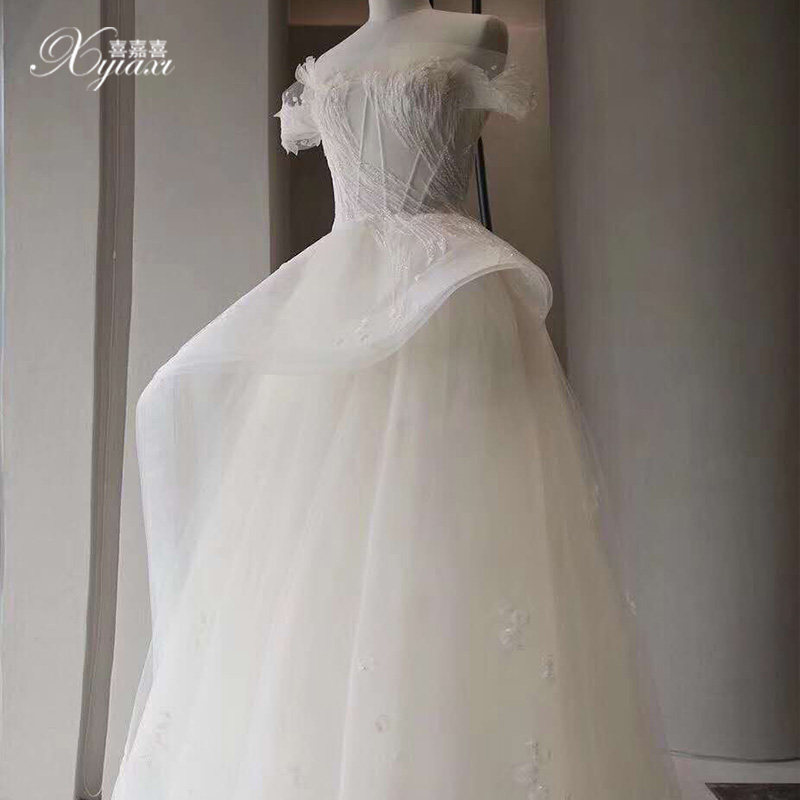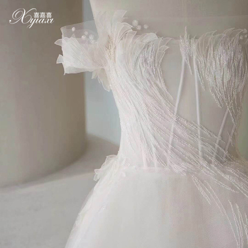 Fan-style light main wedding dress 2021 new straight shoulder 2020 woman minimalist atmosphere small child bridal temperament big drag tail
