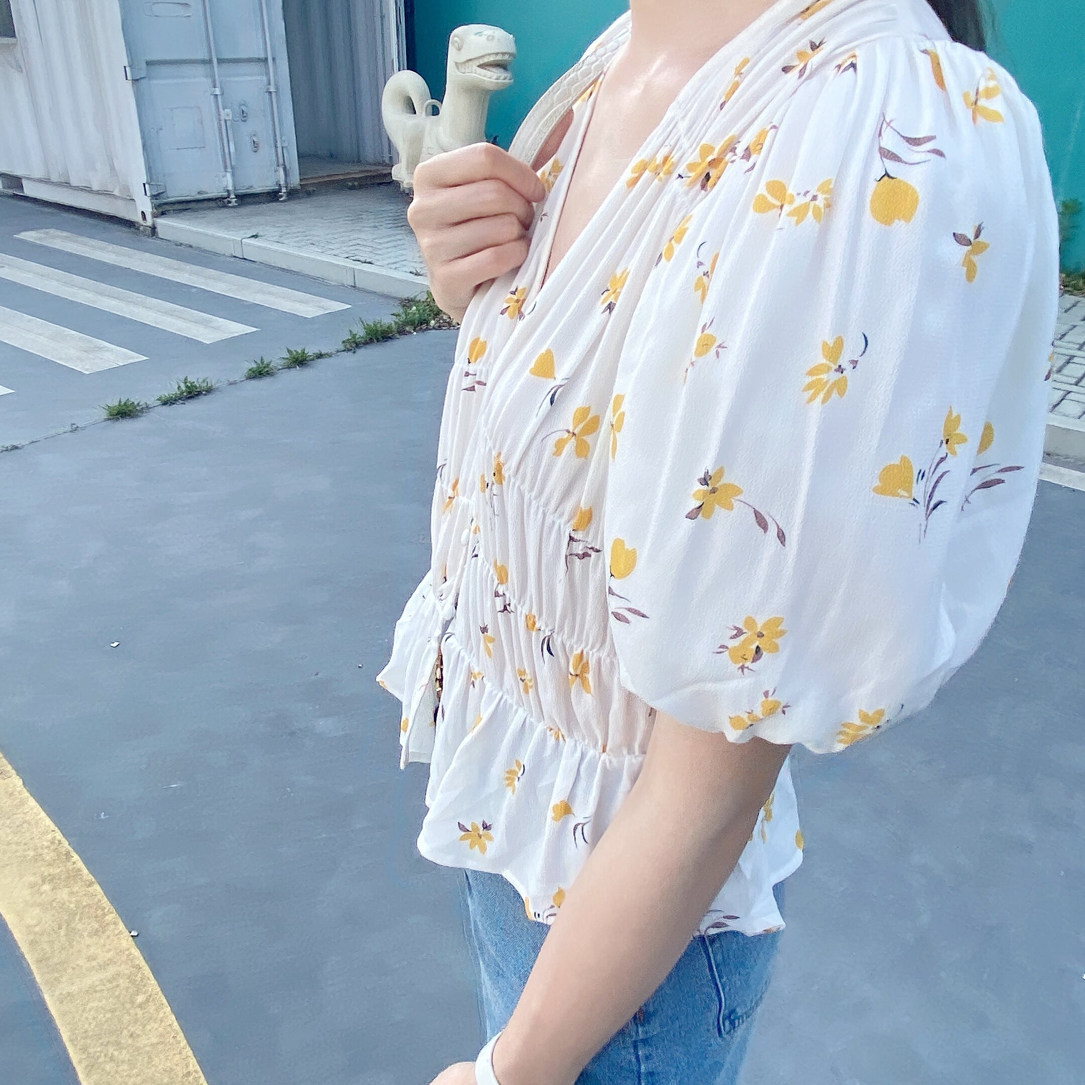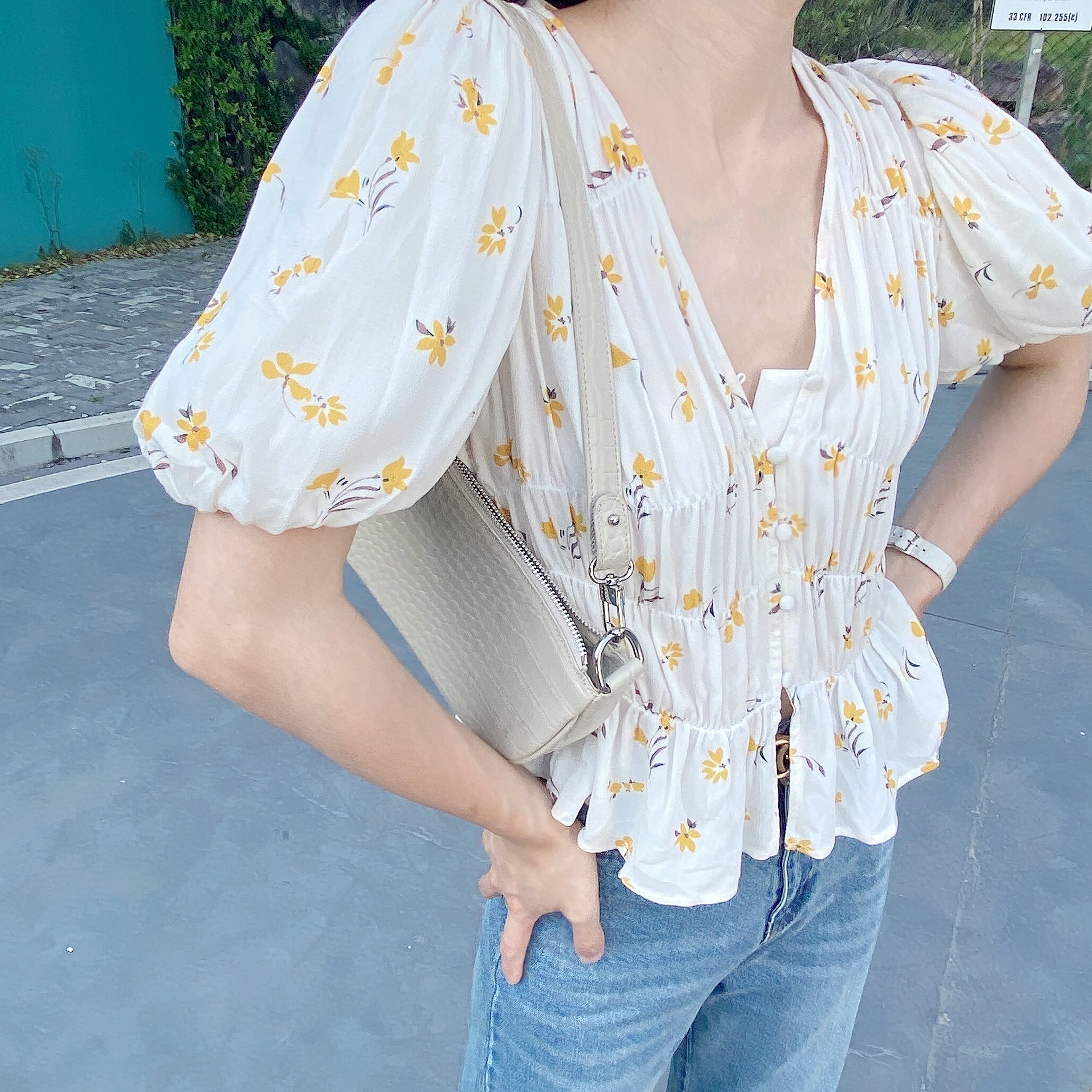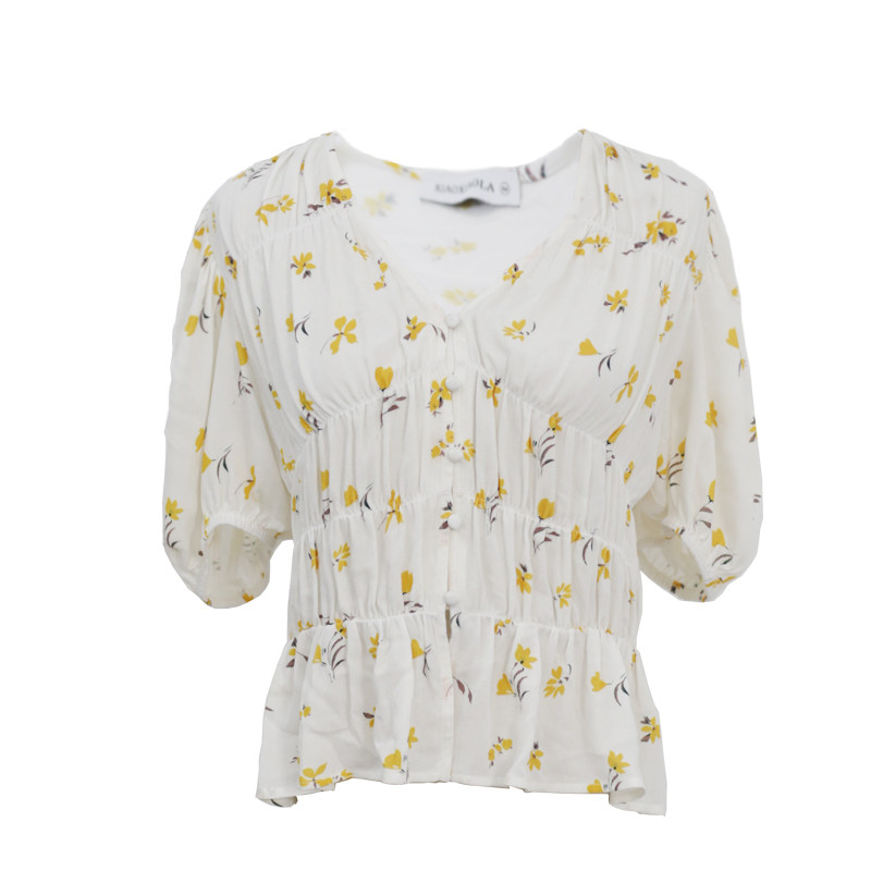 Small pull produced classic small yellow flower small shirt small fairy top waist chiffon shirt summer new temperament Western style