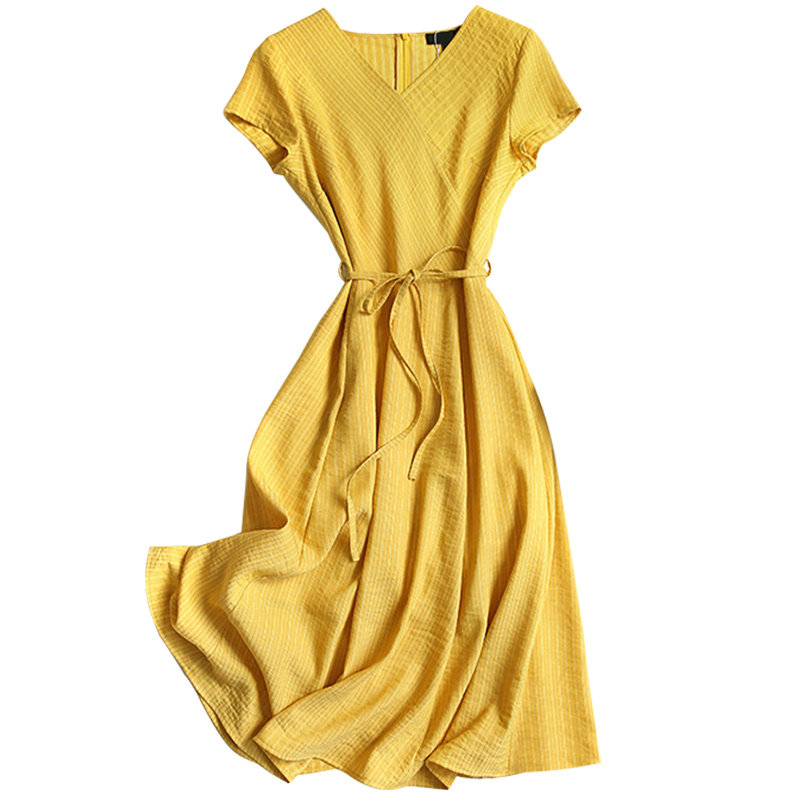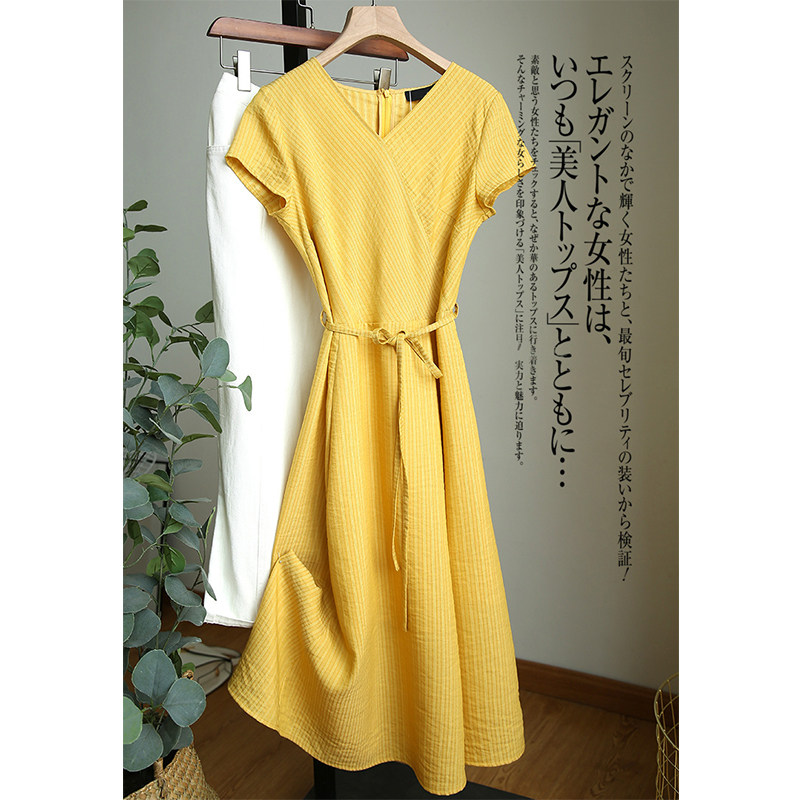 Clean Air type ~ gentle and bright ~ small man medium and long version waist slim striped vneck dress