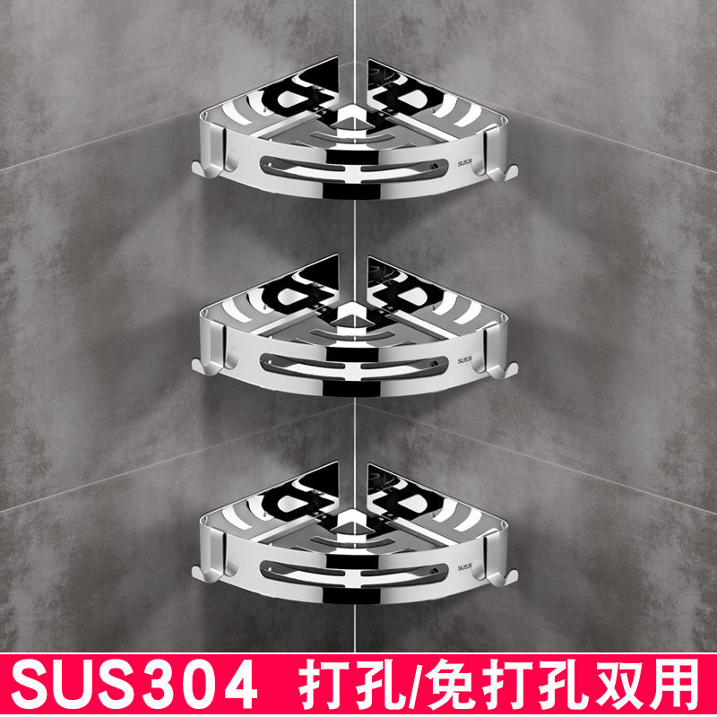 304 stainless steel powder room shelf wall-mounted hole-free bathroom corner shower room triangle basket storage
