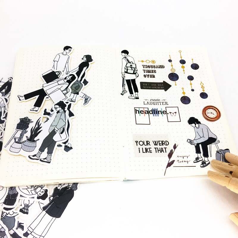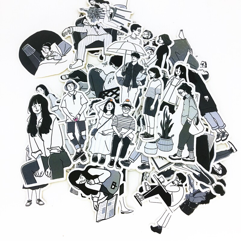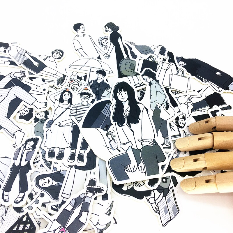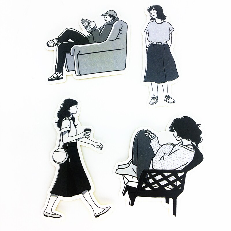 Hand account stickers literary black and white characters boys and girls cartoon hand account diary illustration retro style casual stickers