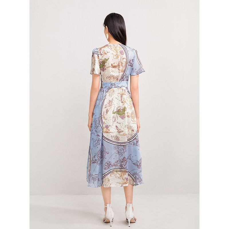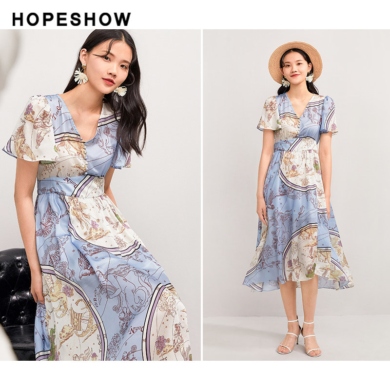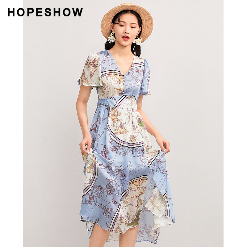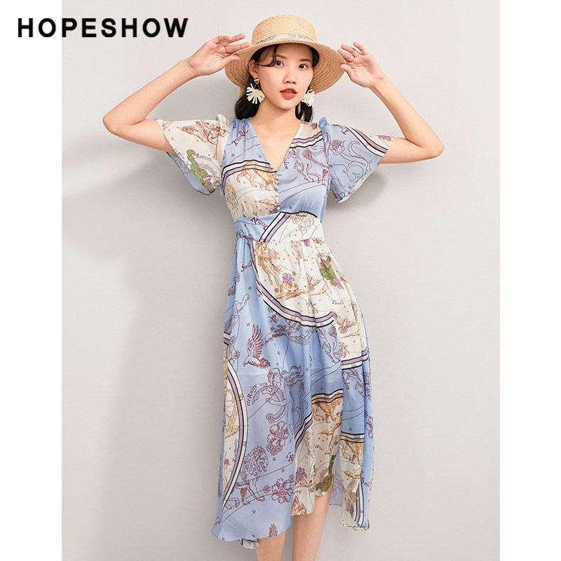 Red Cuff Hopeshow Medium Long Dress Summer New Women's Dress Deep V Collar Splicing National Wind High Waisted Snowspun one-piece dress
