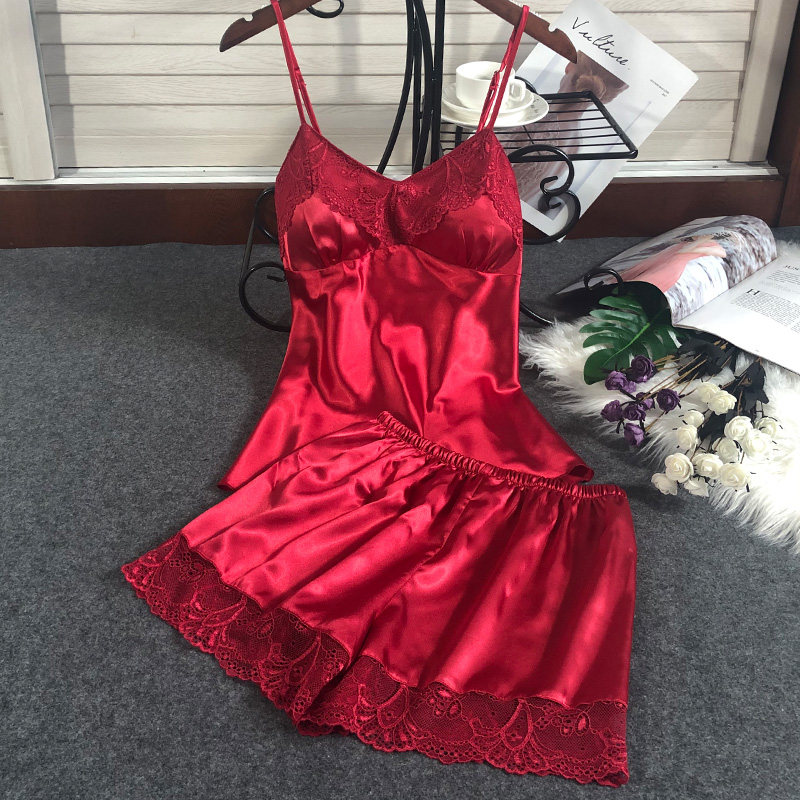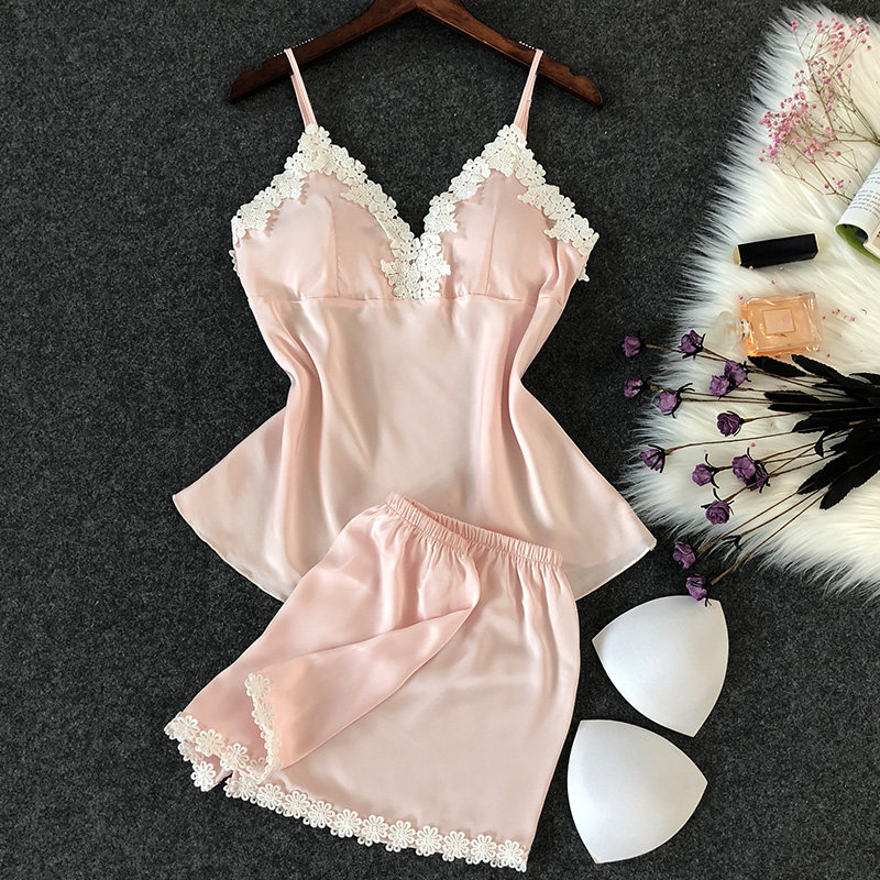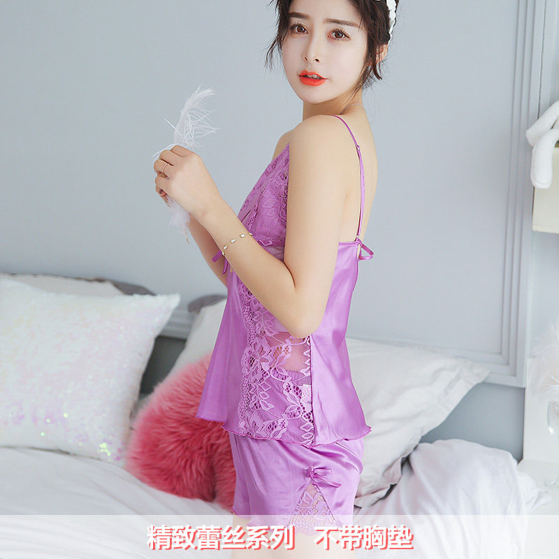 Super fire summer sexy pajamas women's ice silk thin short-sleeved shorts suspender chest pad two-piece suit home clothes tide