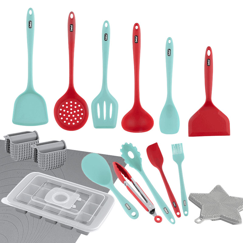 Rice spoon (red) Silicone anti-hot hand clip Silicone tape cover ice grid Silicone face pad Spatula (red) Soup spoon (red) Frying spatula (blue) Colander (red) Fishing spoon (red) Salad spoon (red) Silicone oil brush scraper (red) Silicone oil brush scraper (blue) Fish spatula (red) Fish spatula (blue) Silicone dishwashing brush