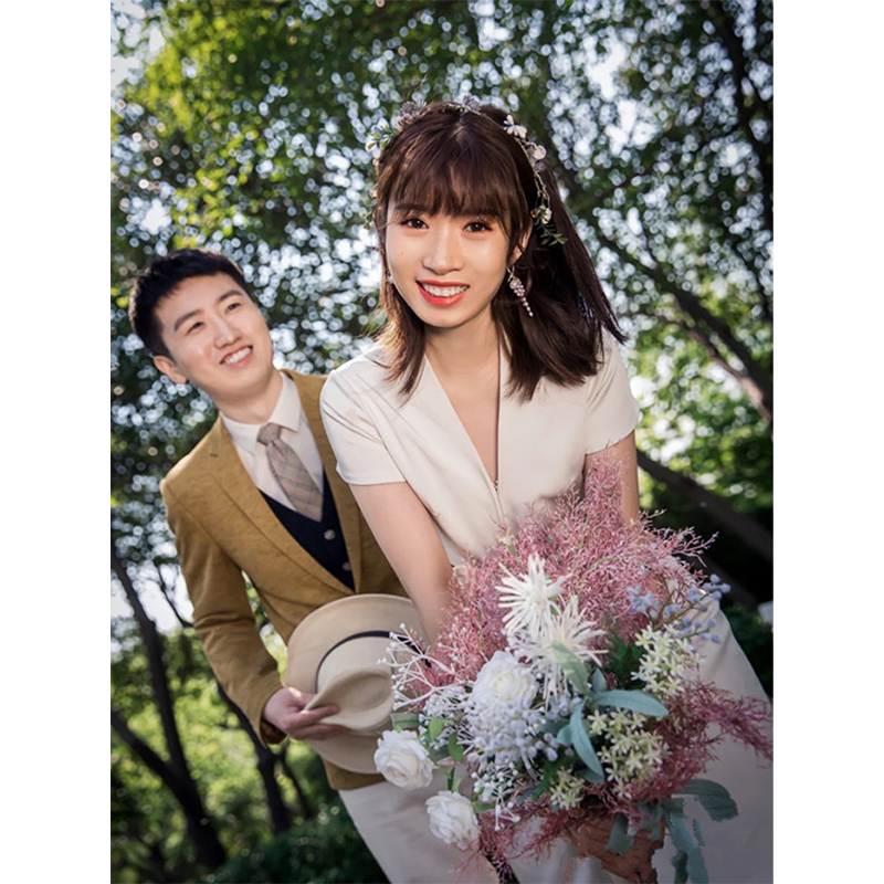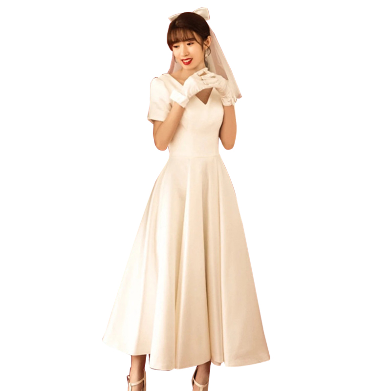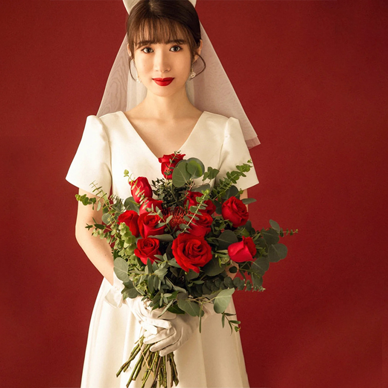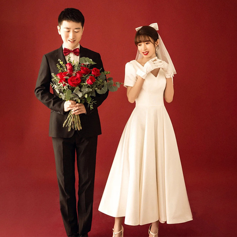 Fa-style retro light wedding dress 2021 new satin minimalist white V neckline Bridal Bridal's Brigade slapped out of the door veil