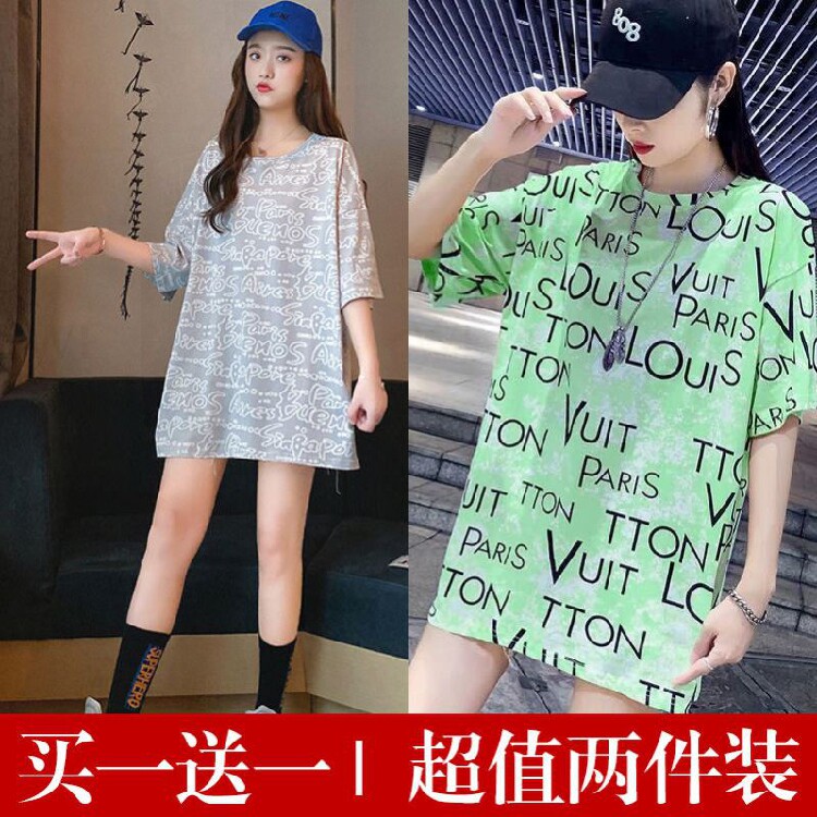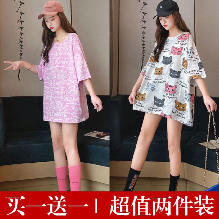 Simple medium-long seven-point sleeve half-sleeve body flat skirt printed fashion short-sleeved t-shirt female ins tide loose cool Korean version