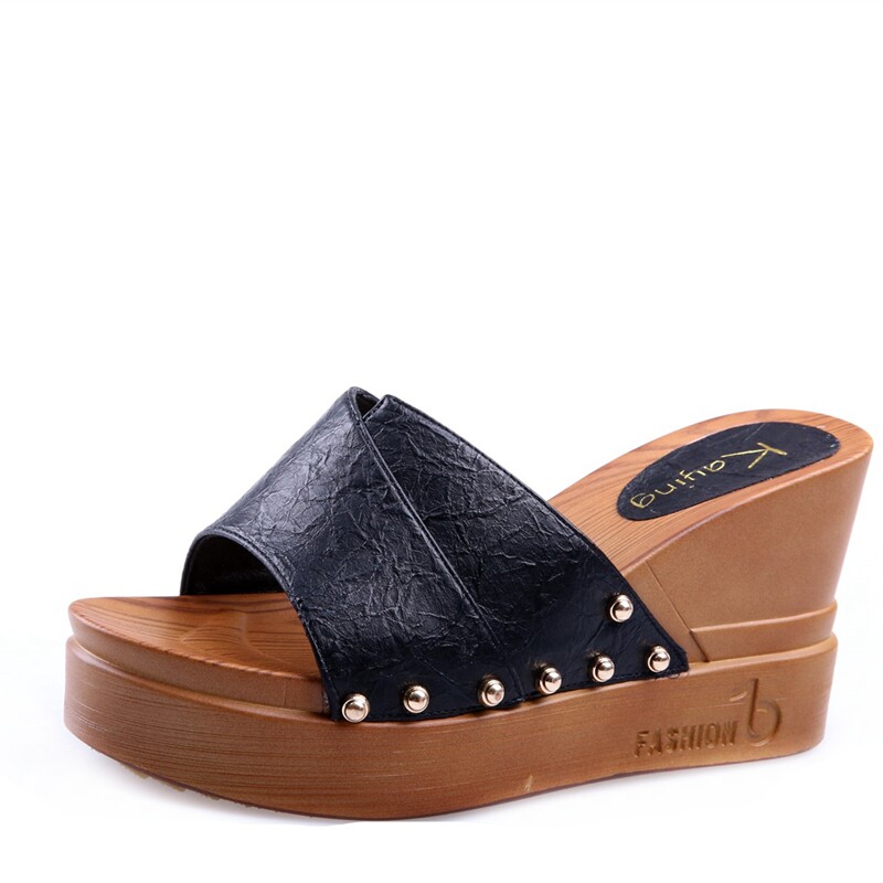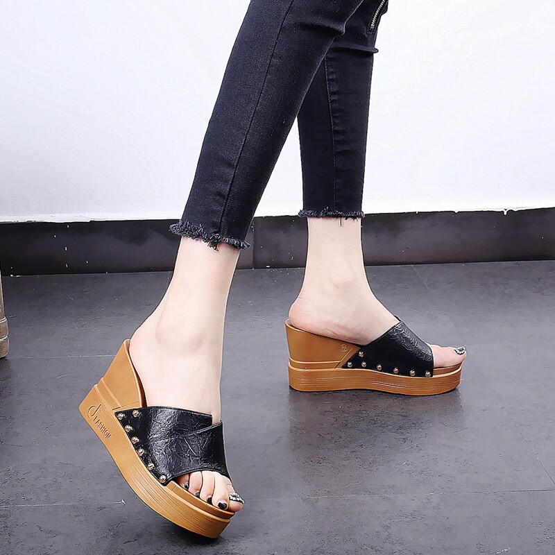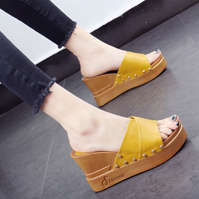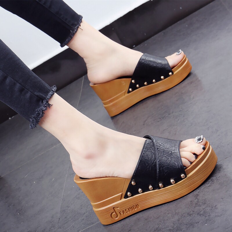Tide brand 2022 new wedge heel slippers women's summer fashion wear all-match thick bottom rivets high-heeled net red beach sandals and slippers