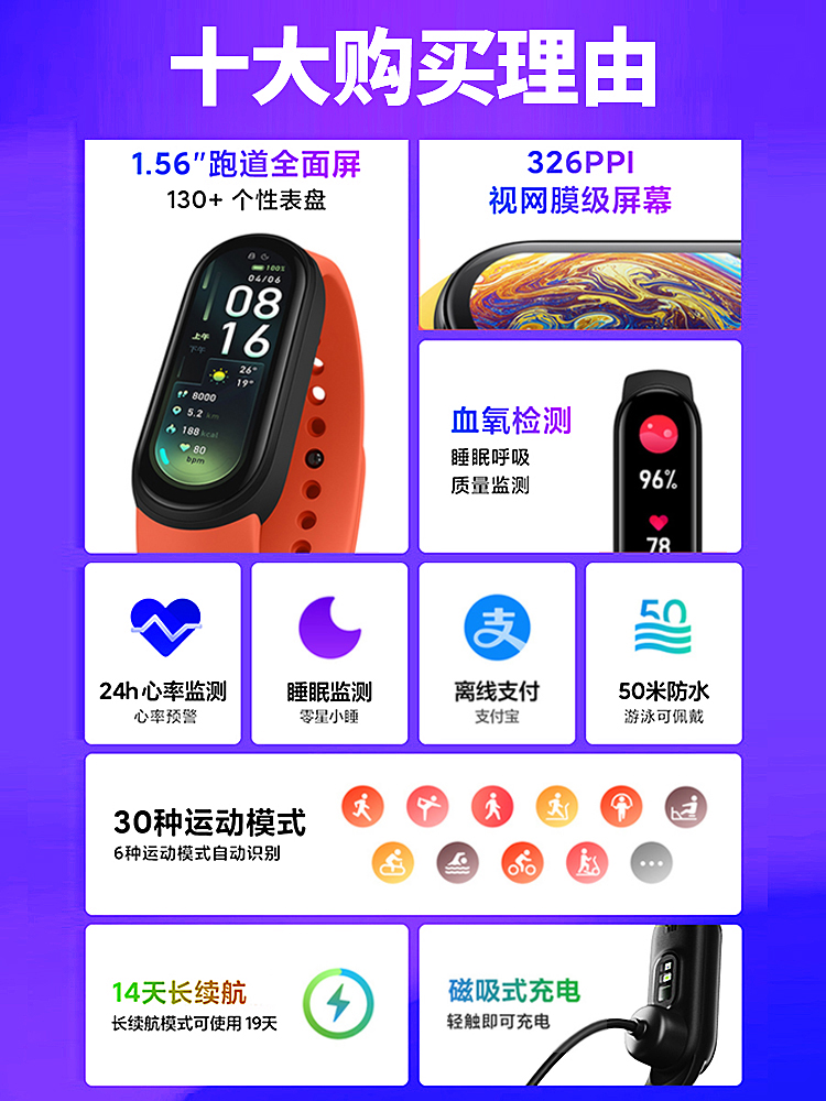 Xiaomi Bracelet 6NFC Smart Blood Oxygen Heart Rate Monitoring Bluetooth Men and Women Sports Pedometer Payment Weather Sleep Couple Watch Bracelet 5 Health Waterproof Upgrade Bracelet