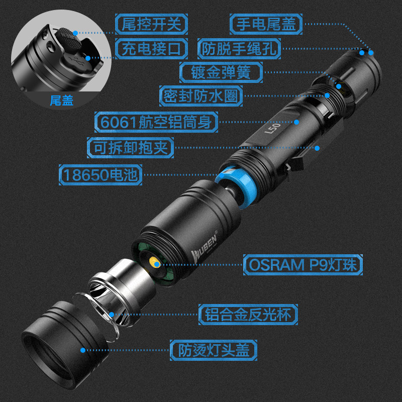 (WE Equipment Library) Wuben L50 Professional Outdoor Flashlight Waterproof Strong Light Flashlight USB Direct Charge Rechargeable Battery