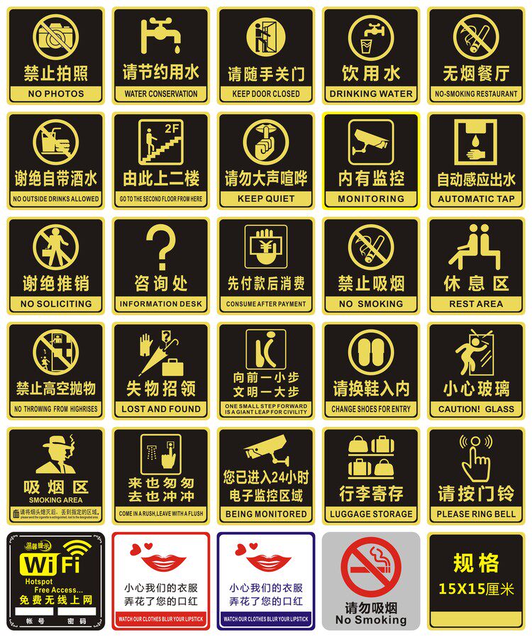 Black No smoking black please move outside black smoking area black non-smoking restaurant black no smoking in air-conditioned room black with monitoring black please save water black cash register