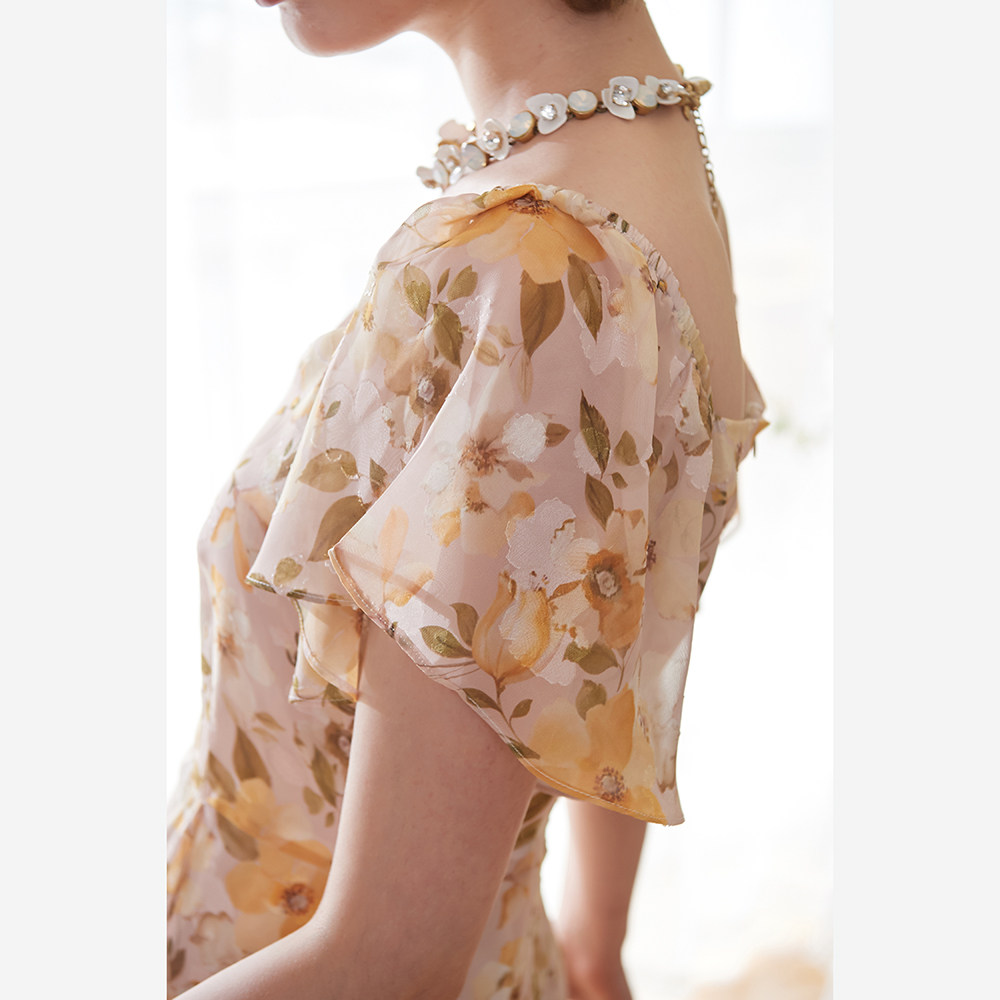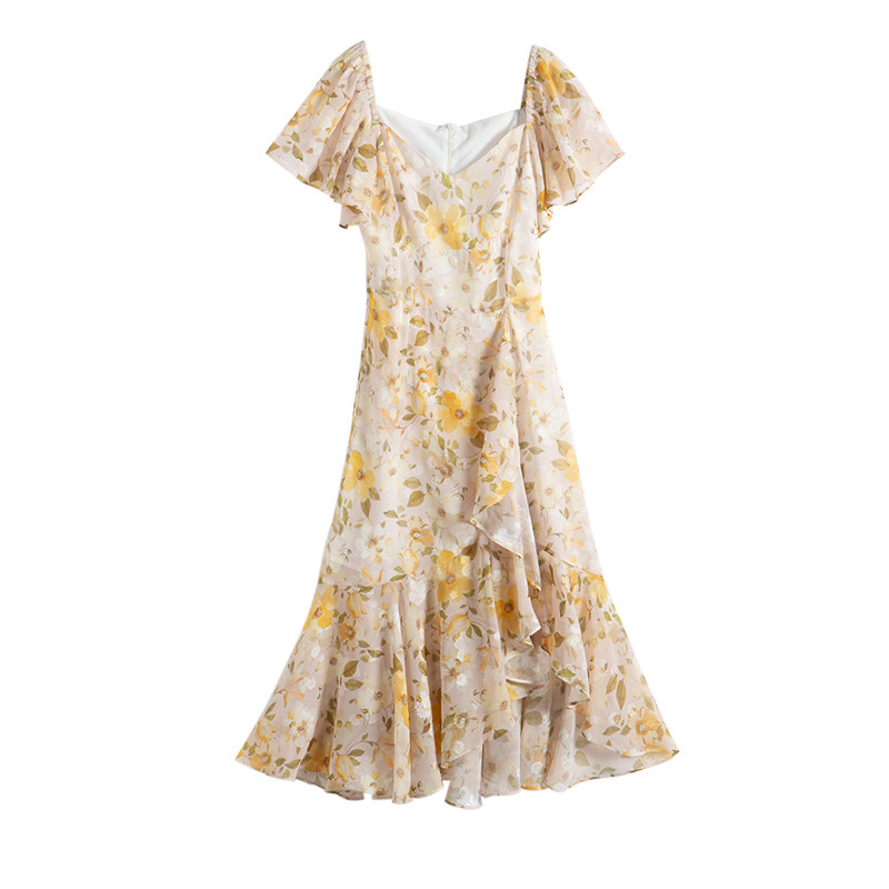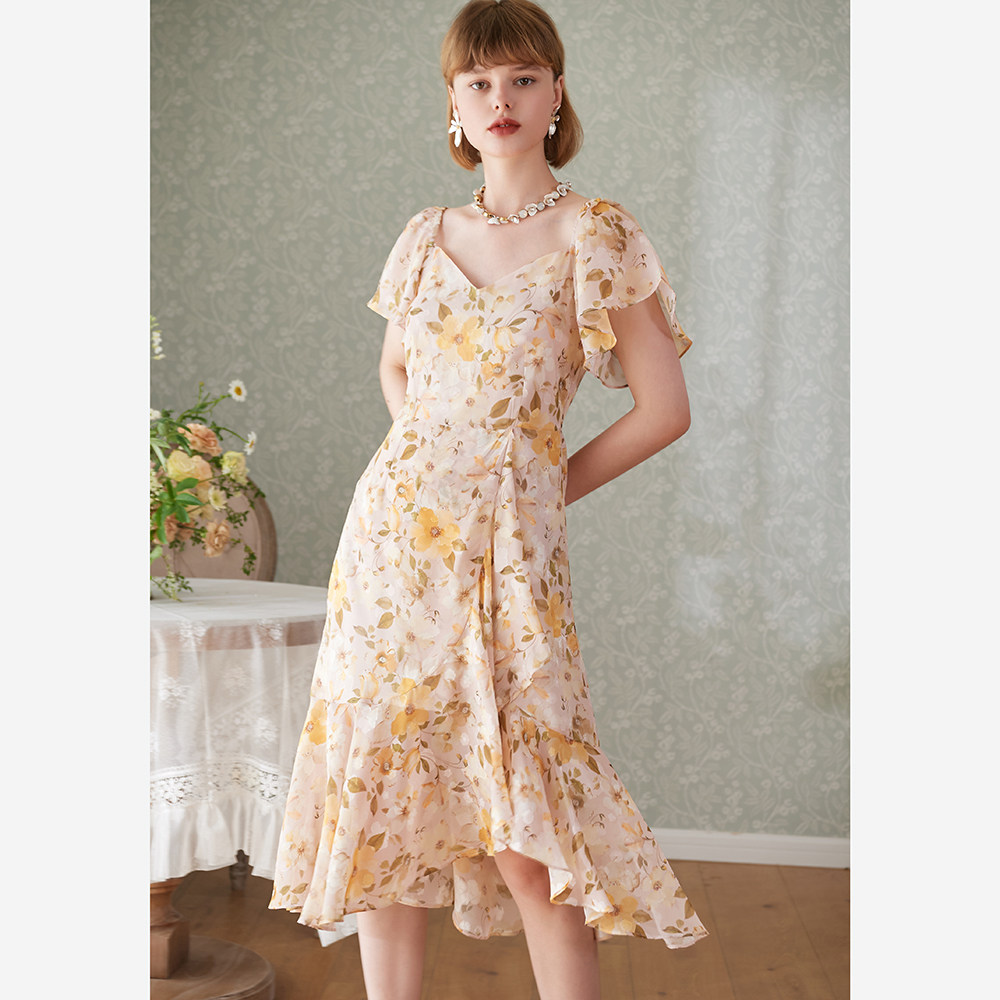 Oz country (designer) Hepburn style French floral dress women summer waist tea break split fishtail skirt