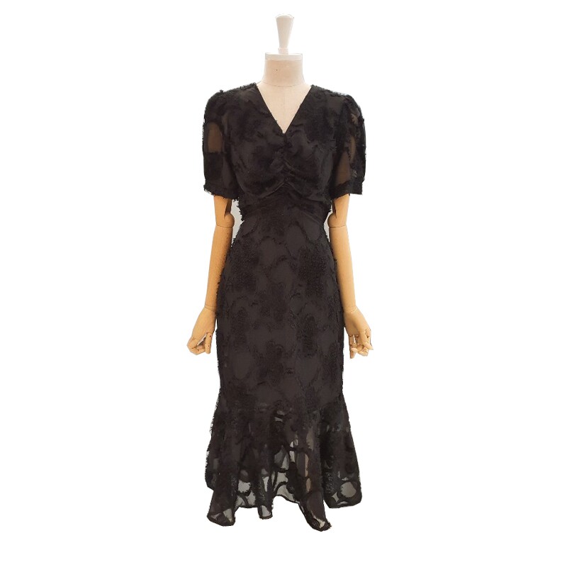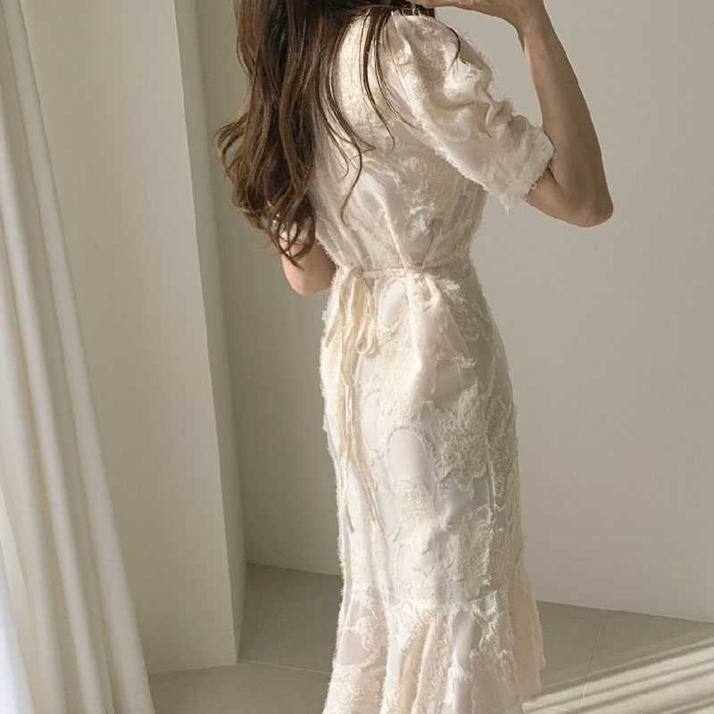 Black dress summer high-end sense beautiful temperament waist lace puff sleeves V-neck chiffon bag hip mermaid skirt female