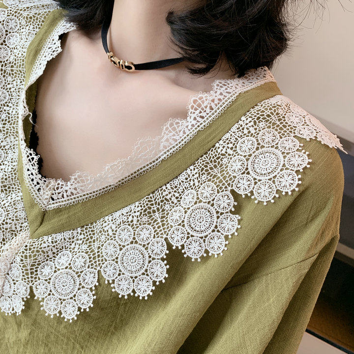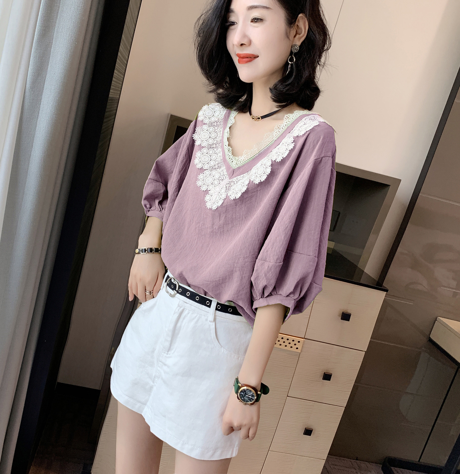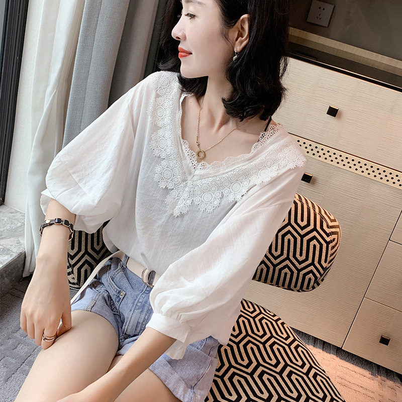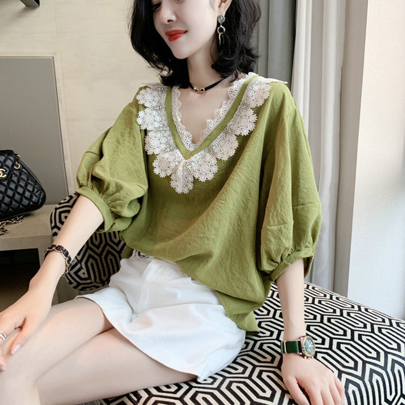 Europe Station 2022 New European Stock Tide Dolls Cotton Linen Shirts Spring Thin lanterns purple Bubble Sleeves Blouse