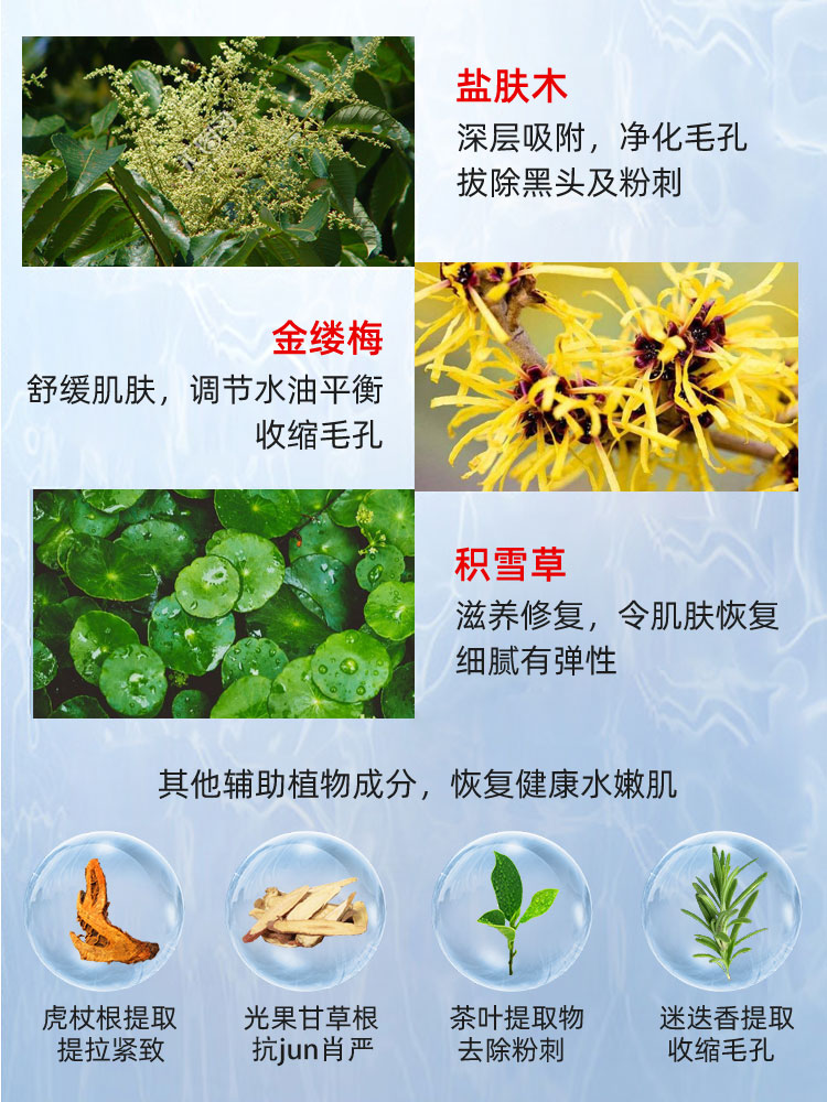 Moisturizing, deep cleansing, shrinking pores, controlling oil, replenishing water, removing blackheads