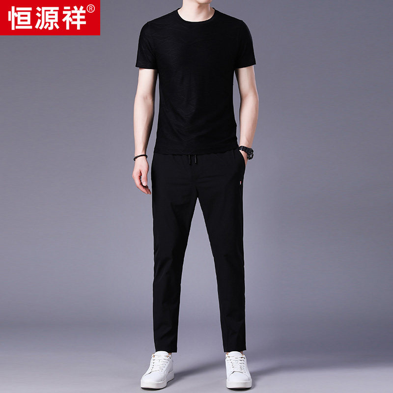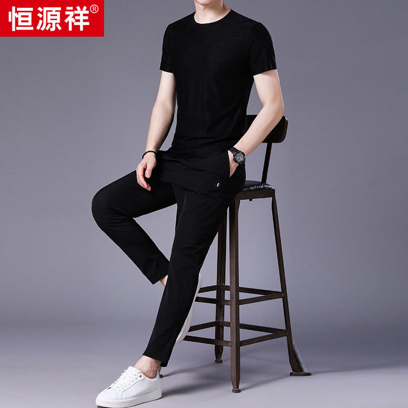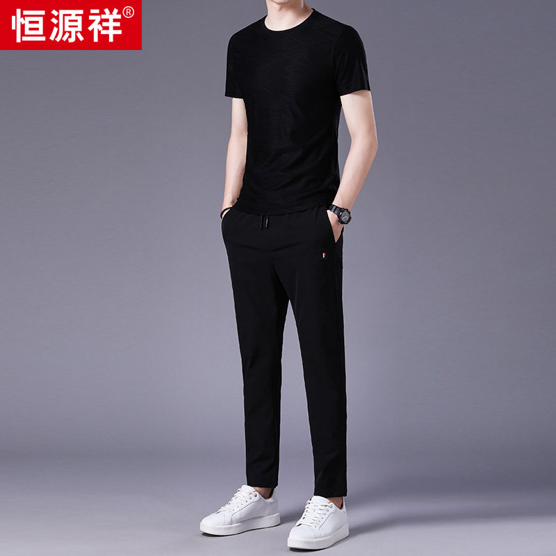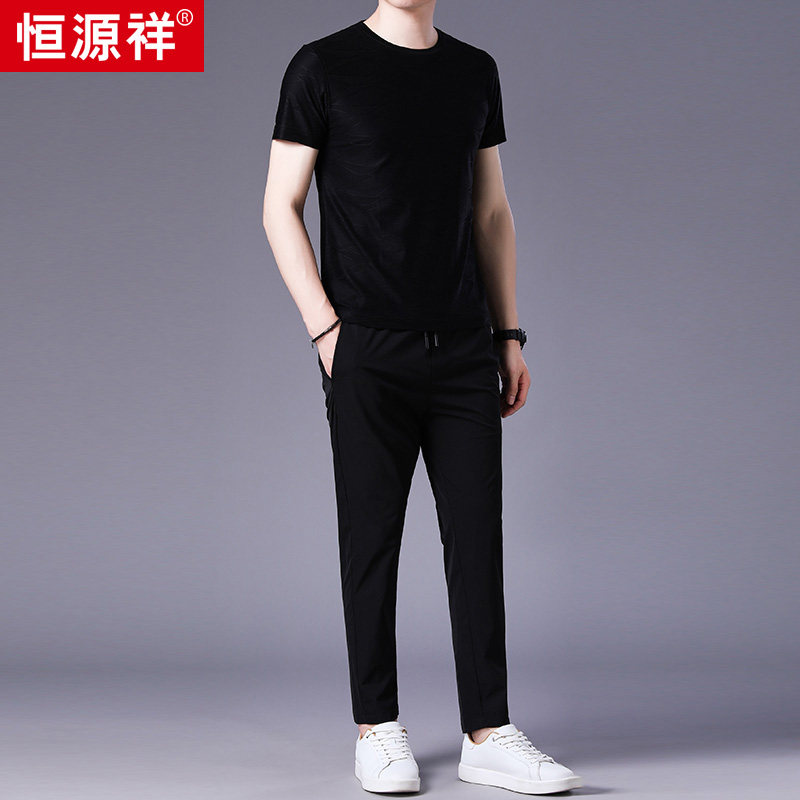 Hengyuanxiang Mulberry silk short-sleeved t-shirt men's fashion brand trend sports suit men's set of casual clothes men