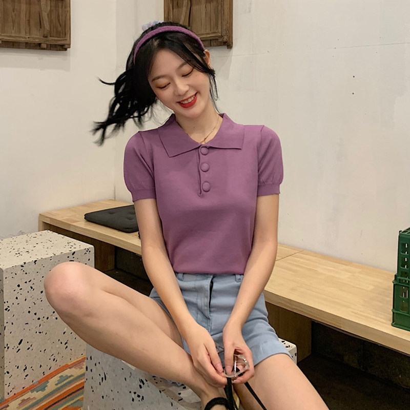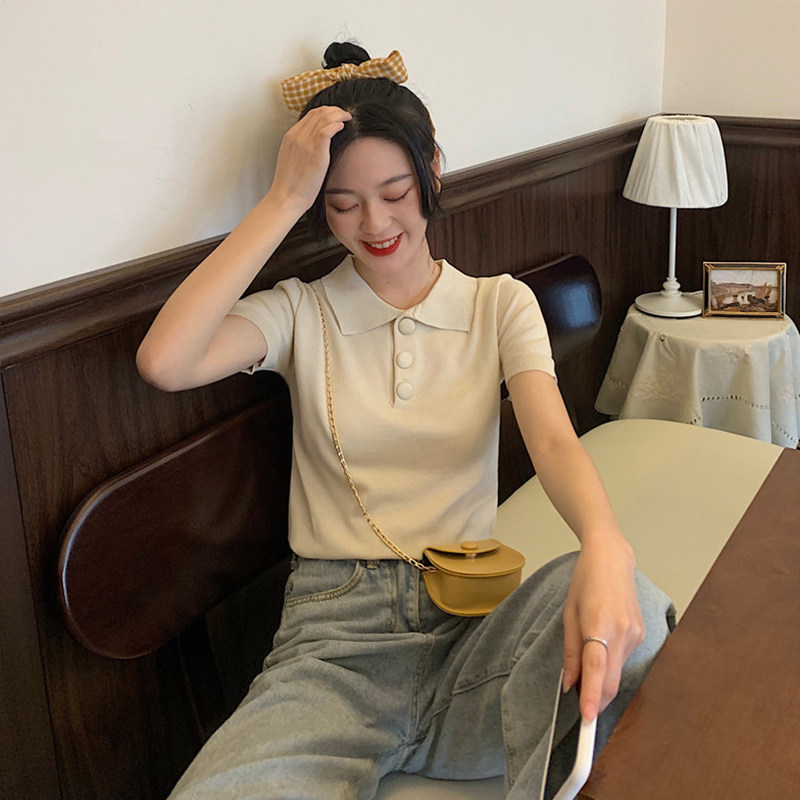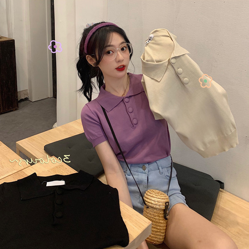 Summer new Korean version Black Polo collar ice-knitted sweatshirt with short sleeve T-shirt for short sleeves T-shirt