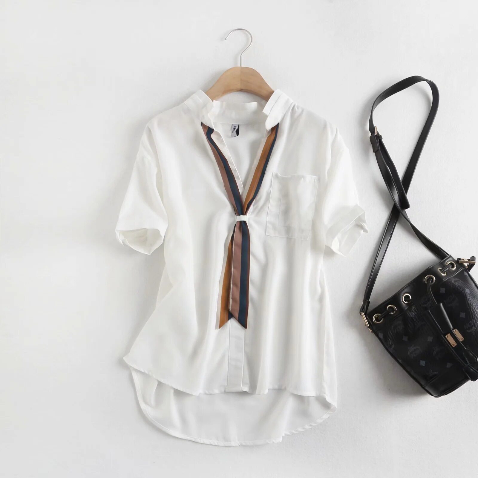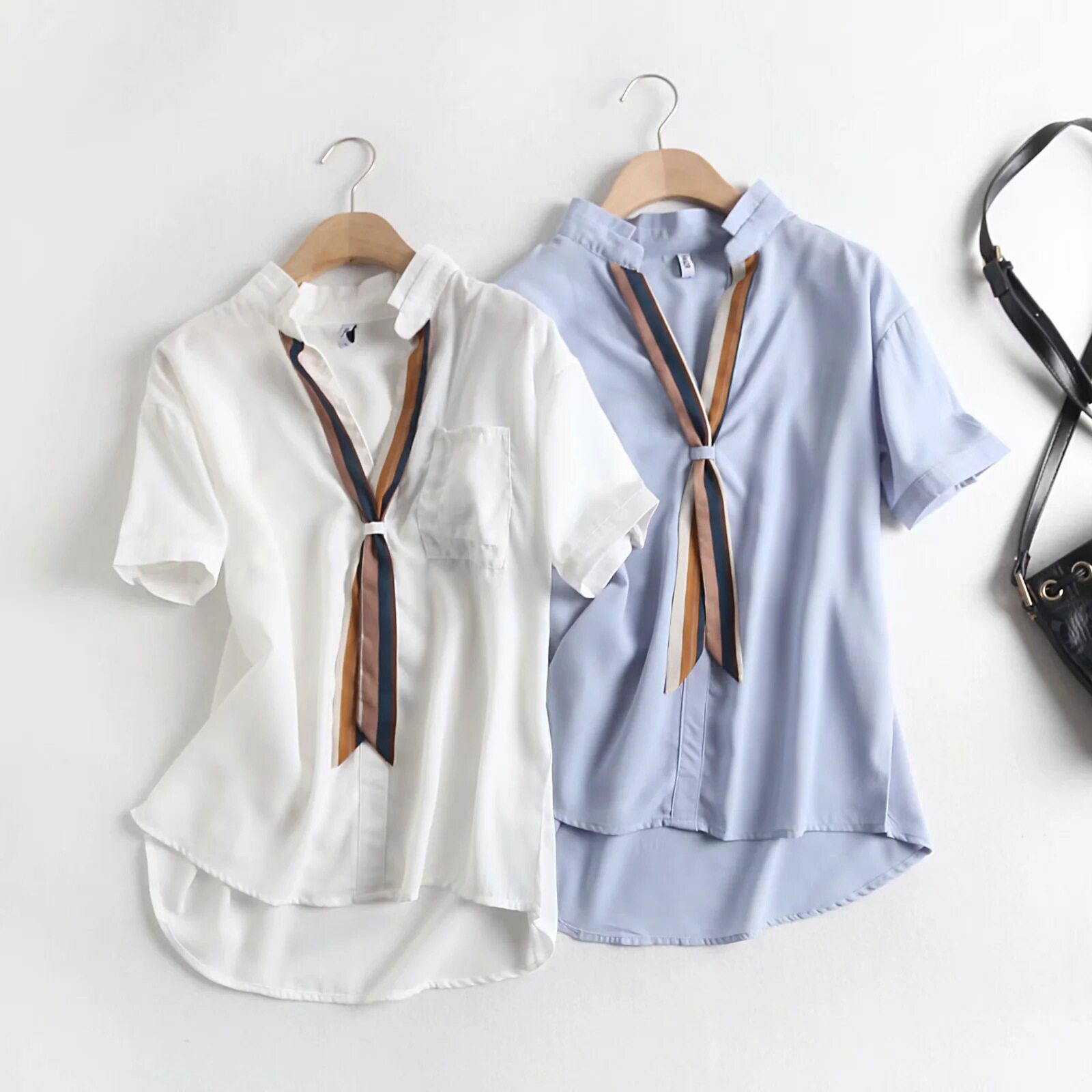2022 spring and summer new foreign trade export factory single cut label discount thin vertical striped bow tie short-sleeved shirt shirt